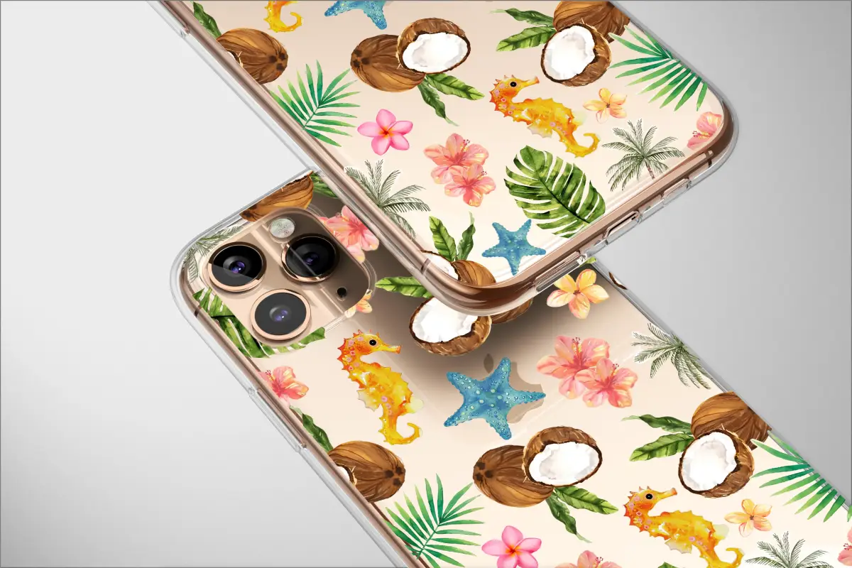 Dive into a breathtaking midnight oasis where the magic of the tropics comes alive against a dramatic dark canvas. This stunning watercolor design captures the very essence of a moonlit stroll on an exotic, secluded beach, bringing a tangible piece of paradise right to your fingertips. Imagine the scent of salt in the air as you admire this vibrant scene. Luscious, freshly cracked coconuts, vibrant coral hibiscus, and delicate pink and yellow plumeria blossoms burst with intoxicating color, their soft petals rendered in exquisite detail. These brilliant botanicals pop against the deep, night-sky background, evoking the intimate feel of a warm summer evening. Lush palm fronds and iconic monstera leaves seem to sway in a gentle, unseen sea breeze, their green hues adding depth and life to the composition. Hidden amongst the flora are charming coastal treasures: brilliant blue starfish dot the scene like fallen stars, while a whimsical golden seahorse drifts by, adding a touch of underwater wonder and magic. Each element is painted in a soft, dreamy watercolor style, creating a unique and artistic collage of island life. This artwork is more than just a pattern; it’s a perfect escape for the soul and an ideal gift for any beach lover, dreamer, or traveler who yearns to carry the feeling of a perpetual vacation and coastal charm with them every single day.
