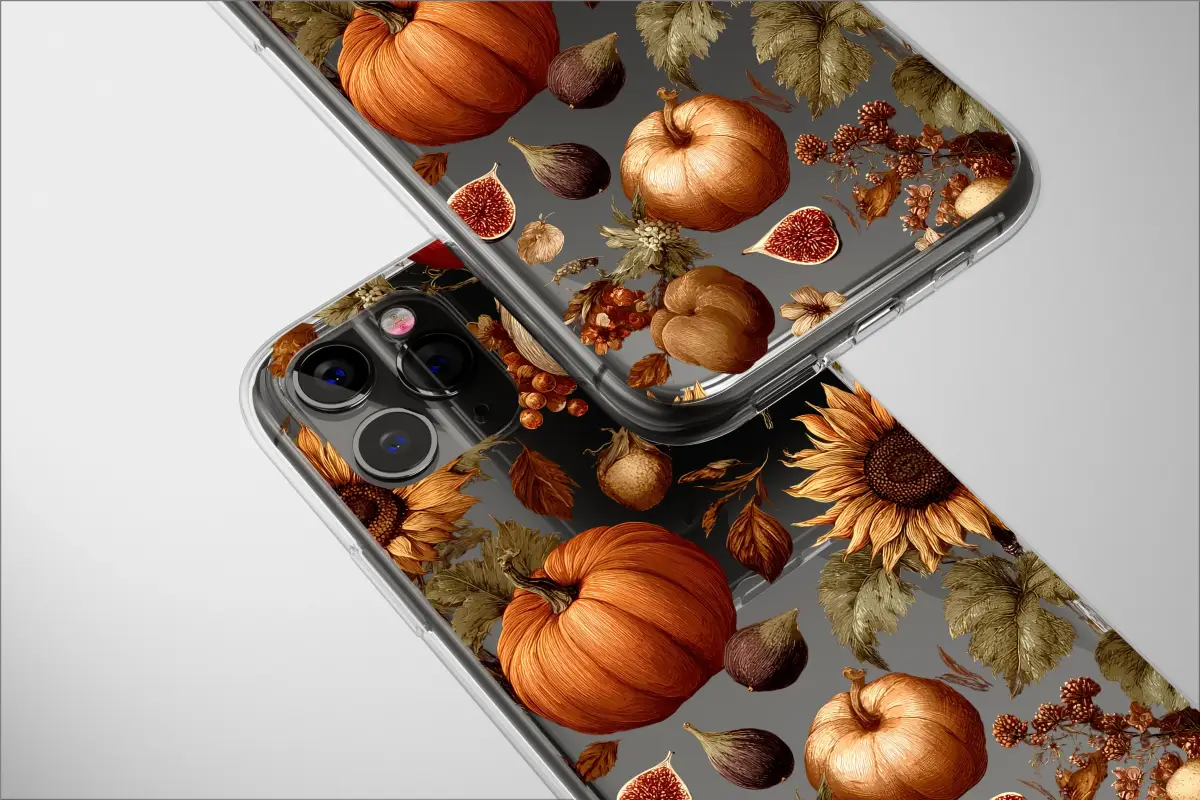 Embrace the enchanting spirit of autumn with this breathtaking design, a rich tapestry that captures the soul of a midnight harvest. Imagine strolling through a moonlit garden where golden sunflowers turn their faces to the dark, their petals glowing with an inner warmth. Plump, heirloom pumpkins in shades of warm ochre and rustic cream nestle amongst deep green foliage, their textures so vivid you can almost feel their smooth, cool skin. Juicy figs, split open to reveal their ruby seeds, and a single crimson apple add a touch of sweet temptation to this bountiful scene. Set against a dramatic black backdrop, this vintage-inspired botanical illustration evokes the feeling of a classical still-life painting, blending dark academia elegance with rustic cottagecore charm. Let this moody and sophisticated artwork adorn your most essential accessory, carrying the cozy, magical essence of the fall season with you every day. It's the perfect way to add a touch of nature's artistry and timeless beauty to your personal style, a small masterpiece celebrating the earth's generous bounty.