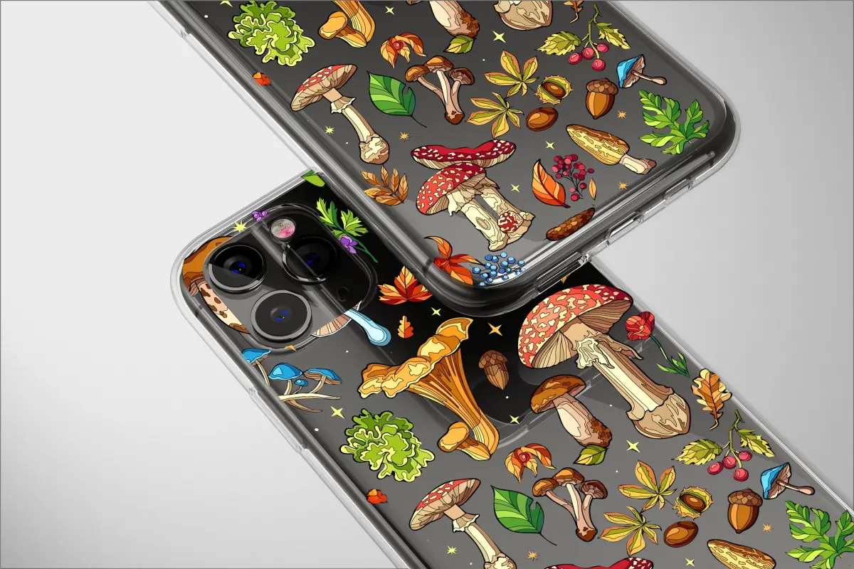 Wander deep into a secret woodland realm where magic glimmers in the twilight with this enchanting botanical illustration. Every glance reveals a new treasure foraged from the mystical forest floor, captured in a stunning, stained-glass art style against a deep, dark canvas that feels like the midnight sky. Discover whimsical, crimson-capped amanita mushrooms standing proud, mysterious blue fungi glowing with an otherworldly light, and golden chanterelles promising untold secrets of the woods. Autumn leaves in shades of rust and ochre tumble gracefully between sprigs of potent herbs, ripe berries, and sturdy acorns, each element sparkling with a touch of starlight. This intricate design, with its rich, earthy tones and pops of magical color, is a love letter to the quiet magic of nature's bounty. It's an essential piece for anyone who feels the pull of cottagecore charm, the earthy allure of goblincore, or the moody romance of a dark academia aesthetic. Let this captivating pattern be your daily portal to an enchanted world, a tangible piece of the forest’s soul that adorns your most essential accessory. It’s more than just a design; it’s an invitation to awaken your sense of wonder and carry the wild, untamed beauty of the earth with you wherever you roam.