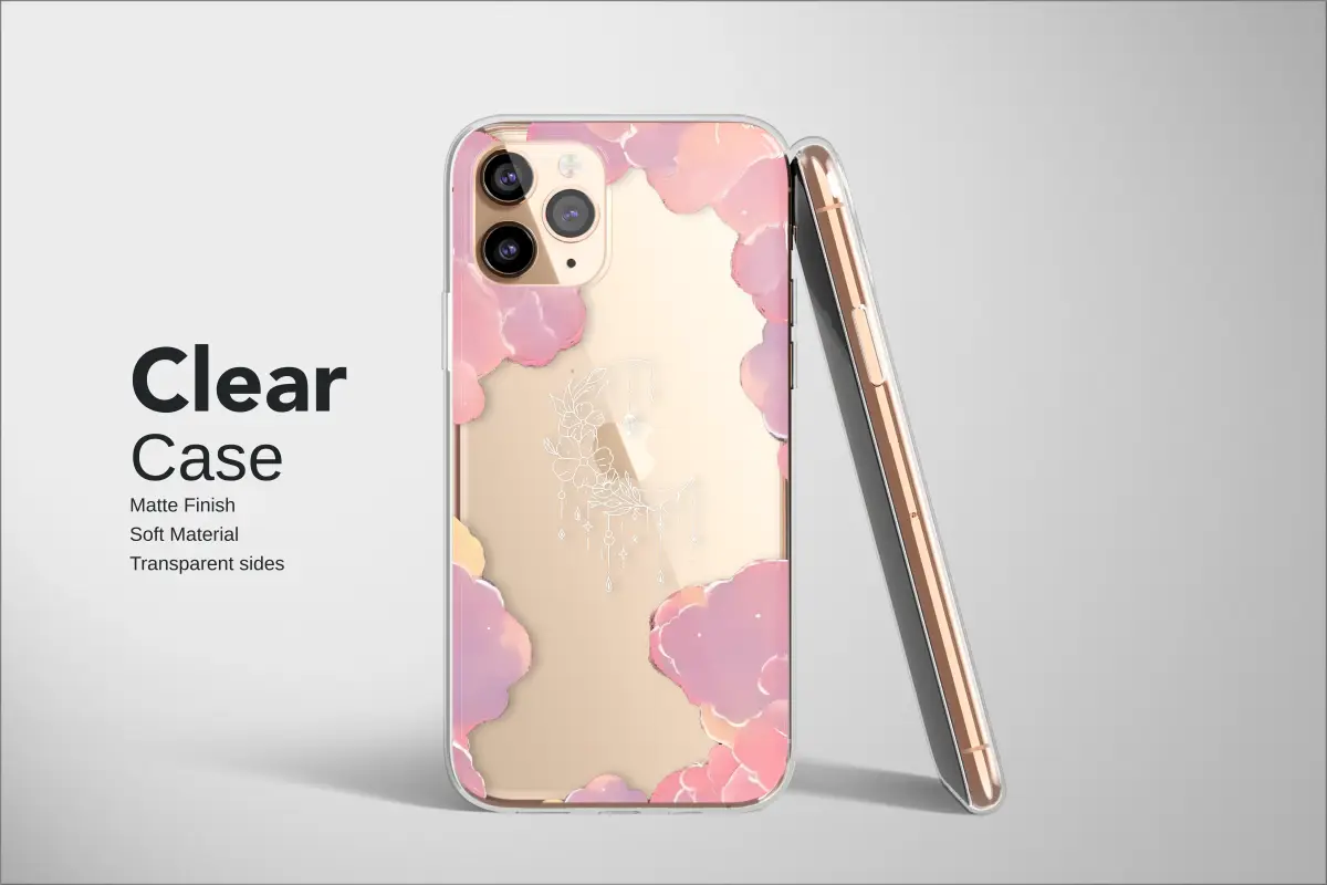 Drift away on a sea of twilight clouds, each puff painted in the ethereal hues of a soft sunset, glowing with shades of gentle pink and warm peach. Suspended in the quiet darkness of the midnight sky is a delicate crescent moon, not of silver, but of intricate, starlit lines that whisper of ancient magic and hidden gardens. Lush florals bloom along its graceful curve while tiny, whimsical charms and shimmering jewels dangle below, catching imaginary light like captured dewdrops and forgotten stars. This enchanting celestial design wraps your most essential companion in a layer of cosmic wonder, transforming a daily tool into a personal talisman of dreamy protection. Perfect for the modern witch, the boho dreamer, or anyone captivated by ethereal beauty, this artwork offers a daily portal to a serene, magical world. It’s a piece of cottagecore fantasy in the palm of your hand, a constant reminder of the quiet magic that exists between dusk and dawn. Carry this stunning floral moon with you and let its serene, witchy charm be your little secret, a unique gift for the stargazer in your life or a beautiful, mystical treat for your own soul.