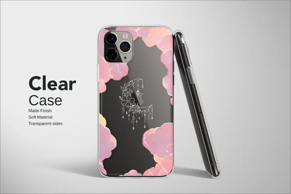 Drift away on a sea of twilight clouds, each puff painted in the ethereal hues of a soft sunset, glowing with shades of gentle pink and warm peach. Suspended in the quiet darkness of the midnight sky is a delicate crescent moon, not of silver, but of intricate, starlit lines that whisper of ancient magic and hidden gardens. Lush florals bloom along its graceful curve while tiny, whimsical charms and shimmering jewels dangle below, catching imaginary light like captured dewdrops and forgotten stars. This enchanting celestial design wraps your most essential companion in a layer of cosmic wonder, transforming a daily tool into a personal talisman of dreamy protection. Perfect for the modern witch, the boho dreamer, or anyone captivated by ethereal beauty, this artwork offers a daily portal to a serene, magical world. It’s a piece of cottagecore fantasy in the palm of your hand, a constant reminder of the quiet magic that exists between dusk and dawn. Carry this stunning floral moon with you and let its serene, witchy charm be your little secret, a unique gift for the stargazer in your life or a beautiful, mystical treat for your own soul.