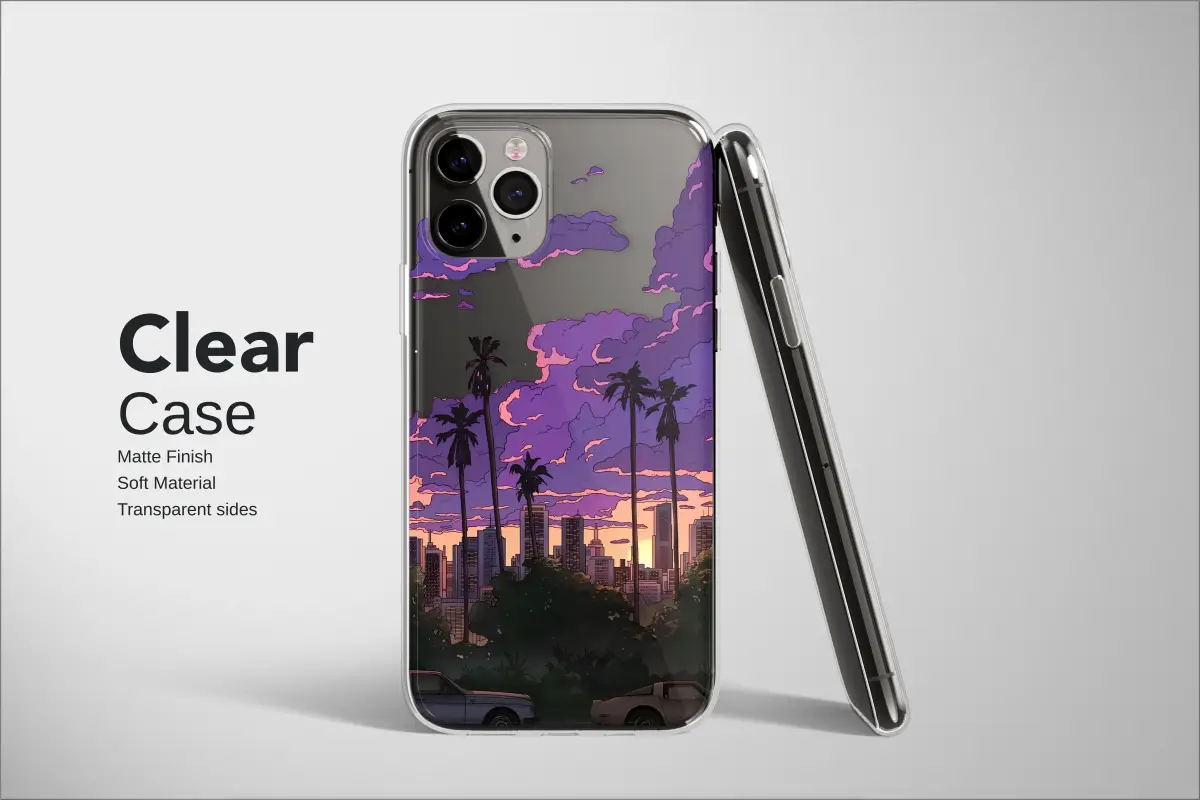 Cruise into a breathtaking dreamscape where the sun dips below the horizon, painting the entire city in intoxicating shades of electric purple, deep violet, and warm apricot. This captivating anime-style illustration perfectly captures the soul of a California twilight, a single moment of perfect calm suspended in time. Towering palm trees stand like silent sentinels against a sky filled with stylized, billowing clouds, their dark silhouettes a striking contrast to the glowing cityscape just beginning to awaken for the night. Down below, classic cars from a bygone era wait patiently on a quiet street, hinting at late-night drives with synthwave soundtracks pulsing from the stereo. This design is a love letter to 80s and 90s nostalgia, beautifully blending a moody lofi aesthetic with a vibrant, vaporwave color palette that feels both retro and futuristic. It’s for the dreamers, the night owls, and anyone who feels a pang of sweet melancholy for a past they've only seen in movies. Let this stunning cityscape art transform your most essential daily accessory into a piece of portable escapism, letting you carry the cool, cinematic vibe of a sunset drive with you wherever you go.