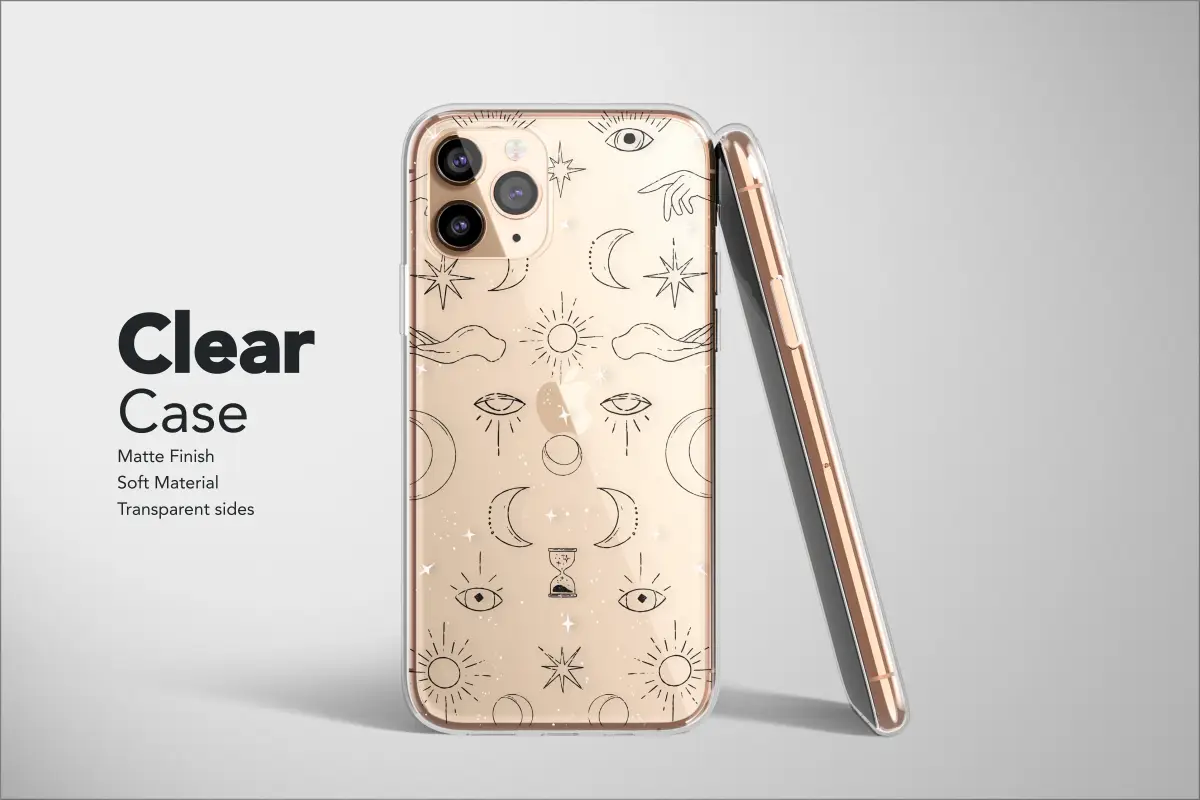 Embrace the magic of the cosmos and carry a pocketful of starlight with this enchanting celestial design, a perfect accessory for the modern mystic. Set against an endless night-sky black, this intricate pattern is a powerful tribute to all things esoteric and spiritual. Delicate, hand-drawn style line art depicts a universe of potent symbols: the radiant sun offers its energy, while the serene crescent moon governs the tides of emotion, surrounded by constellations of twinkling stars scattered like celestial dust. Discover the protective gaze of the all-seeing eye, a timeless talisman and charm to guard your energy and deflect negativity, a true piece of evil eye protection art. Guiding hands emerge from the darkness, seeming to shape destiny and reach for cosmic knowledge, while a delicate hourglass whispers of the fleeting nature of time and the importance of the present moment. This design is an absolute essential for the modern witch, the dedicated astrology enthusiast, or any spiritual soul seeking to align their personal style with their inner beliefs. It seamlessly blends witchy, boho chic, and gothic dark academia aesthetics, making it a versatile statement piece. More than just a decoration for your device, it's a piece of wearable occult art that tells a story, making it a thoughtful and unique gift for the moonchild or stargazer in your life. Adorn your most essential gadget with a touch of personal magic.