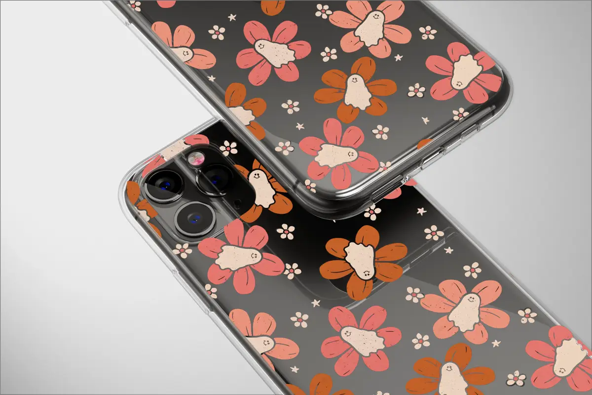 Step into a whimsical midnight garden where spooky-cute charm blossoms after dark! Our "Groovy Ghost Garden" design is a playful dreamscape, capturing a dance of friendly little spirits nestled amongst 70s-inspired flowers. Each smiling ghost, crafted with a soft, vintage texture, finds a cozy home atop petals of warm terracotta, burnt orange, and dusty rose, all set against a dreamy, starlit black canvas. This unique artwork is imbued with a nostalgic, well-loved feel, like a treasured find from a bohemian flea market. It's more than just a pattern; it’s a mood, perfect for the free spirit who finds joy in the quirky and magical, blending a love for retro aesthetics with a touch of gentle Halloween spookiness. Let this enchanting, artistic shield wrap around your most essential daily companion, keeping it safe while showcasing your wonderfully whimsical style. A perfect gift for the retro-loving, ghost-hunting soul in your life, this accessory brings a pop of dark cottagecore and hippie magic to your everyday carry. Embrace the spooky season all year long and carry a little haunted flower patch wherever you go, turning your daily tech into a piece of enchanting art.