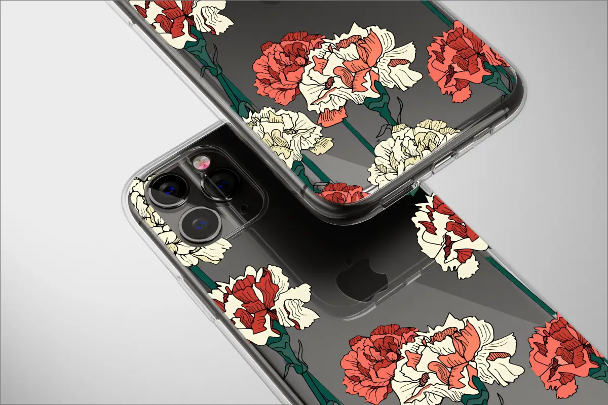 Immerse yourself in the quiet drama of a midnight garden with this stunning botanical artwork. Against a canvas of deep, velvety black, elegant carnations unfold in a display of timeless grace, their forms captured in a captivating graphic style reminiscent of classic Art Nouveau illustrations and vintage woodblock prints. Each bloom is a masterpiece of detail, from the ruffled edges of the petals to the delicate linework that gives them texture and life. The sophisticated color palette is a study in beautiful contrasts—creamy, gentle ivories bloom alongside passionate corals and deep, romantic crimsons, creating a visual poetry that is both bold and exquisitely refined. This is not just a floral pattern; it is a mood, an aesthetic. A perfect choice for the lover of dark academia, romantic goth style, or anyone who appreciates a sophisticated, artistic statement. It speaks of secret gardens, whispered poetry, and the enduring allure of nature's darker, more mysterious side. Let this exquisite design transform your most-used accessory into a piece of wearable art, a daily reminder of beauty that blossoms even in the shadows. It’s a unique and thoughtful gift for the art enthusiast, the nature lover, or the soul who finds elegance in the beautifully unconventional.