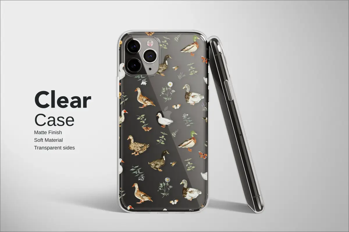 Immerse yourself in the idyllic charm of a countryside meadow with this enchanting and intricate design. This artwork captures the heartwarming essence of a rustic duck pond, rendered in a delicate and timeless watercolor style that evokes the pages of a beloved storybook. Against a sophisticated dark backdrop, a delightful flock of ducks comes to life. You'll spot the vibrant green head of a classic mallard, the pure white feathers of a farm duck, and the unique patterns of various other breeds, each with its own distinct personality. These charming birds meander through a tapestry of hand-painted botanicals and gentle wildlife. Delicate butterflies with intricate wings flutter between sprigs of lavender and wild herbs, while busy little bees dance around cheerful marigolds and delicate white daisies. This pattern is a true celebration of nature's simple elegance and the comforting aesthetic of cottagecore living. It’s the perfect way to carry a piece of pastoral peace with you, transforming your most-used accessory into a statement of rustic sophistication. A thoughtful gift for any animal lover, gardener, or soul who finds joy in the quiet beauty of the natural world, this design brings a touch of whimsical magic to the everyday.