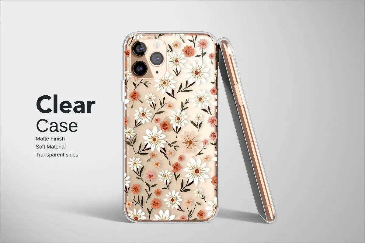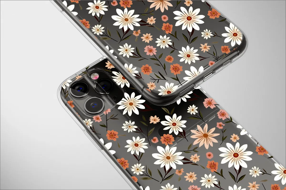Immerse yourself in the enchanting allure of a midnight meadow, where vintage-inspired daisies and wildflowers bloom in a delightful, retro dance against a velvety black canvas. This captivating botanical design captures the quiet magic of a secret garden bathed in moonlight, brought to life with a timeless, groovy charm that speaks to the soul. Each flower is a detailed study in warm, earthy tones; creamy white petals pop with optimistic energy alongside smaller, delicate blossoms in rich terracotta, soft blush pink, and muted apricot orange. Dark olive stems and intricately drawn leaves weave throughout the groovy floral composition, creating a captivating and dense pattern that feels both wonderfully nostalgic and refreshingly modern. This dark cottagecore aesthetic is absolutely perfect for the bohemian at heart, a nature lover looking to transform an everyday essential into a unique statement of personal style and artistry. It's more than just a pattern; it’s a wearable piece of art that serves as a daily reminder of nature's simple, enduring beauty. This makes it a thoughtful and unique gift for her, or for any flower lover in your life. Embrace the whimsical elegance of this dark floral design and let its vintage vibe infuse your world with a touch of botanical magic and effortless cool.