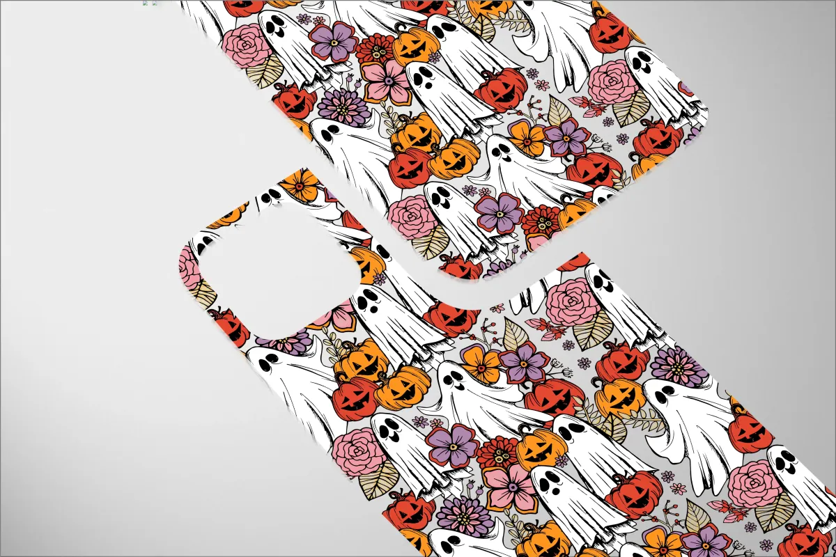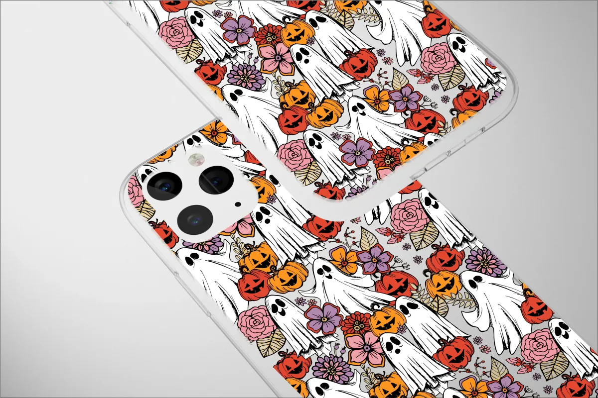 Step into a whimsical autumn dream where spooky season blooms with retro charm! This enchanting design is a delightful haunting, a garden party for the sweetest of spirits. Imagine friendly little ghosts with playful grins floating and dancing amidst a patch of cheeky, smiling jack-o'-lanterns. But this isn't just any pumpkin patch; it's a groovy floral ghost parade, where blushing pink roses, vibrant zinnias, and deep purple blossoms weave between the gourds, creating a truly unique spooky cute aesthetic. The detailed, hand-drawn linework and a warm palette of harvest oranges, dusty pinks, and moody purples give it a vintage, artistic feel, perfect for anyone who loves cottagegore charm or a spooky boho vibe. Wrap your most essential daily companion in this tapestry of fall magic, transforming a simple object into a statement of your love for all things enchanting and autumnal. This Halloweencore art is the perfect accessory to celebrate the season, making it a wonderful gift for her or a personal treat to carry the cozy, whimsical spirit of October with you everywhere you go. Let these happy haunts guard your connection to the world with a touch of playful fright and a whole lot of style.