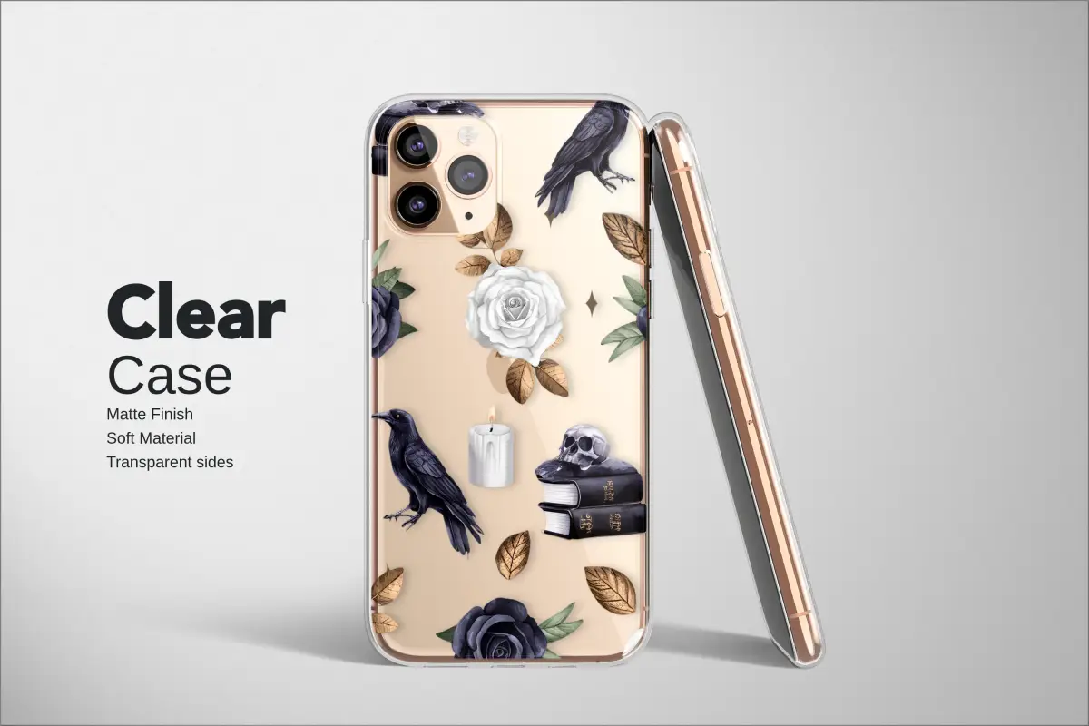 Enshroud your most essential tech in the whispers of a forgotten library and the secrets of a moonlit garden. This enchanting gothic design is a spellbinding tapestry of dark romance and scholastic mystery, perfect for the modern witch or dark academia soul. Ethereal ravens, with feathers of deepest indigo, flutter amongst a hauntingly beautiful scatter of human skulls, ancient spellbooks, and flickering white candles, their light catching on the delicate petals of black and white roses. Glimmers of metallic gold leaves add a touch of luxe, magical warmth to the cool, macabre scene, creating a stunning visual contrast. It’s a perfect witchy accessory that speaks to a love for Edgar Allan Poe, a passion for the occult, and the beauty found in the shadows. Whether you're a cottage goth at heart or searching for a unique gift for her, this mystical design transforms your daily companion into a protective talisman, a piece of wearable art that carries the magic of a secret world with you. Let this moody, botanical pattern be your constant reminder of the magic that lies just beneath the surface of the everyday.