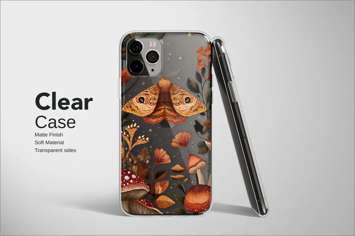 Step into a world of midnight enchantment where woven wings carry secrets of the forest floor. This captivating design captures a moment of pure magic, with a majestic moth as its centerpiece, its wings intricately detailed as if stitched with threads of twilight and gold. It hovers in a starlit garden, surrounded by a rich tapestry of autumnal life, a scene pulled from a forgotten fairytale. Mysterious fly agaric mushrooms and whimsical toadstools sprout from the darkness, their vibrant reds and earthy tones a stark contrast to the deep, inky black of the night sky where tiny stars glitter like fallen dust. Ginkgo leaves and fantastical ferns in shades of burnt orange, deep green, and rich ochre create a lush, botanical frame, each element rendered with stunning, embroidered-like texture that begs to be touched. This artwork is a perfect accessory for the modern witch, the cottagecore dreamer, or anyone with a goblincore heart who finds beauty in the dark and mystical corners of nature. Let this design transform your favorite accessory into a portal to an enchanted woodland, a daily reminder of the hidden magic that thrives under the moon. It's a thoughtful and unique gift for the nature lover in your life, bringing a touch of whimsical, dark academia elegance to their everyday essentials.