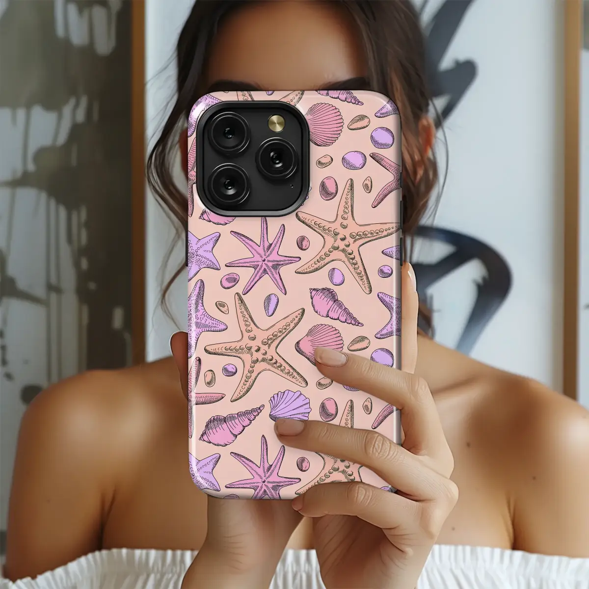 Embrace the serene beauty of the coast with this charming starfish and seashell pattern. The illustration features a delightful array of hand-drawn ocean treasures, including detailed starfish, elegant conch shells, and delicate scallops. Rendered in a soft pastel palette of pink, purple, and peach, this sketch-style artwork captures a whimsical, beachy vibe perfect for any ocean lover.