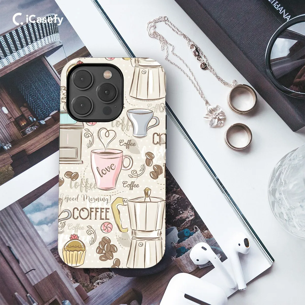 Embrace your love for coffee with this charming phone case featuring a collage of coffee cups, mugs, and coffee beans. Inspired by the comforting rituals of coffee culture, this case evokes the warmth and aroma of your favorite brew. Carry a reminder of your daily pick-me-up with you wherever you go and let your device reflect your passion for the perfect cup of coffee with this delightful accessory.