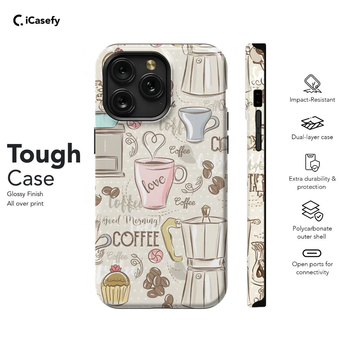 Embrace your love for coffee with this charming phone case featuring a collage of coffee cups, mugs, and coffee beans. Inspired by the comforting rituals of coffee culture, this case evokes the warmth and aroma of your favorite brew. Carry a reminder of your daily pick-me-up with you wherever you go and let your device reflect your passion for the perfect cup of coffee with this delightful accessory.