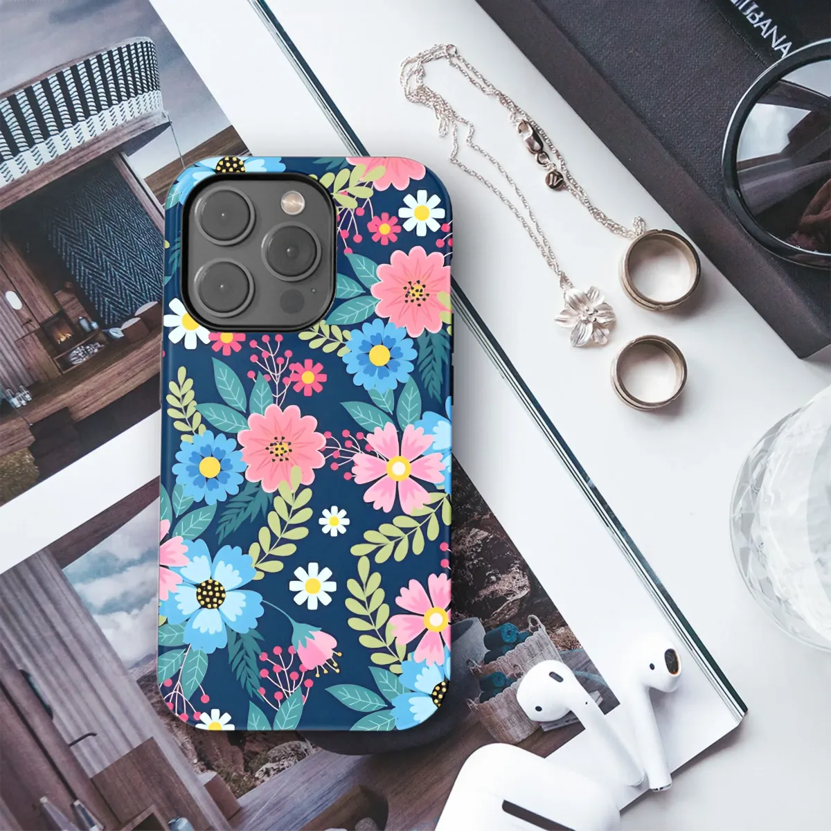 Add a burst of vibrant floral beauty to your everyday with this stunning design. Featuring a cheerful medley of pink and blue blooms, delicate white daisy-like flowers, and lush green leaves, this botanical pattern brings the charm of a lively garden right to your fingertips. The delightful composition is set against a deep, rich navy background, making the vibrant colors pop and creating a sophisticated contrast. Tiny pink berries and scattered white dots add extra detail and whimsy to the overall look. This cheerful floral print is perfect for anyone who loves nature-inspired art, bright colors, and pretty flower patterns. It evokes the feeling of sunshine, blooming gardens, and happy spring or summer days. Use this eye-catching accessory design to personalize your device, adding a touch of feminine style and natural elegance. It's a wonderful way to brighten your day or makes a thoughtful gift for her, perfect for birthdays, holidays, or just because. Embrace the beauty of blossoms and foliage with this charming decorative element that combines artistic flair with practical protection and style. This nature-themed artwork offers a refreshing update, transforming your item into a personal statement piece. Enjoy the intricate details and the lively color palette that celebrate the simple joy of flowers in full bloom.