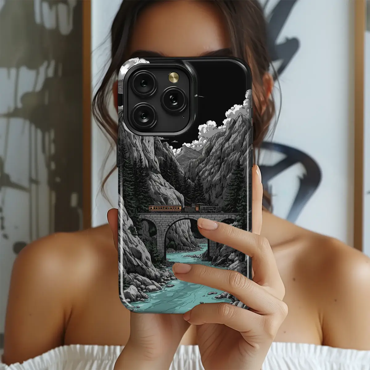 Capture a dramatic moment with this stunning mountain landscape design. This detailed illustration features a vintage train crossing a majestic stone arch bridge over a vibrant turquoise river. Rendered in a bold comic book art style with strong black lines and a contrasting color palette, the scene is set against towering grey peaks and a dark, cloudy night sky, creating a sense of adventure and wonder.