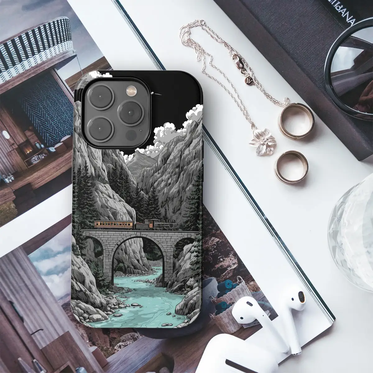 Capture a dramatic moment with this stunning mountain landscape design. This detailed illustration features a vintage train crossing a majestic stone arch bridge over a vibrant turquoise river. Rendered in a bold comic book art style with strong black lines and a contrasting color palette, the scene is set against towering grey peaks and a dark, cloudy night sky, creating a sense of adventure and wonder.