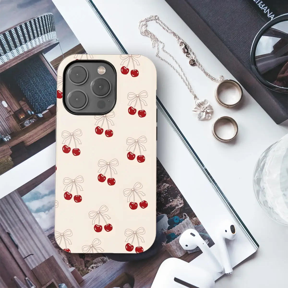 Embrace a sweet and playful aesthetic with this charming design. It features a repeating pattern of juicy red cherries, each pair delicately tied with a coquette-style ribbon bow. The simple line art against a soft cream background creates a vintage, cottagecore feel, perfect for adding a touch of dainty elegance to your favorite accessory.