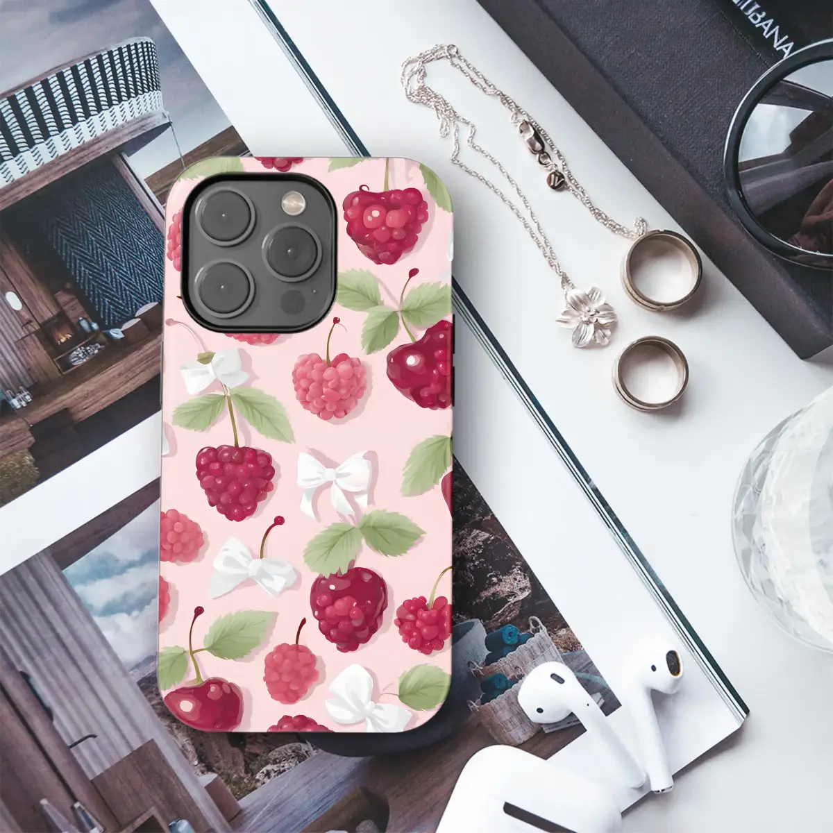 Embrace a sweet and whimsical vibe with this charming fruit pattern. This design features an adorable mix of juicy red cherries and plump raspberries scattered across a soft pink background. Accented with delicate white bows, this print captures the popular coquette and cottagecore aesthetic, perfect for anyone who loves a girly, vintage-inspired look.