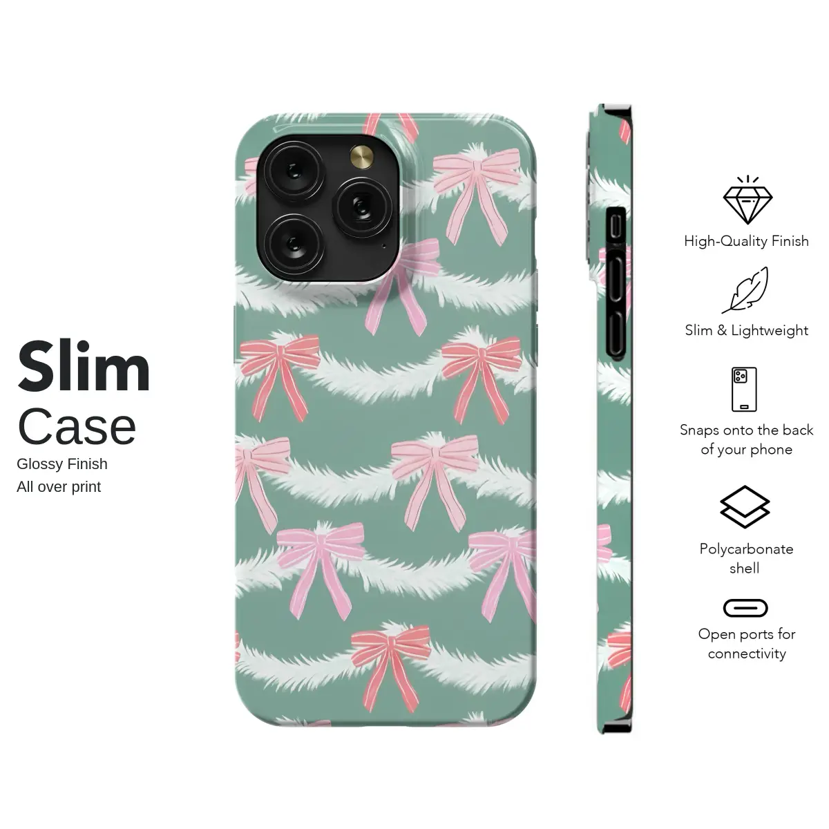 Adorn your accessory with this charming holiday design featuring delicate white tinsel garlands. Sweet pink and red coquette-style bows are scattered across the pattern, creating a festive and whimsical look. Set against a modern sage green background, this design captures a playful yet classic Christmas spirit, perfect for celebrating the season in style.