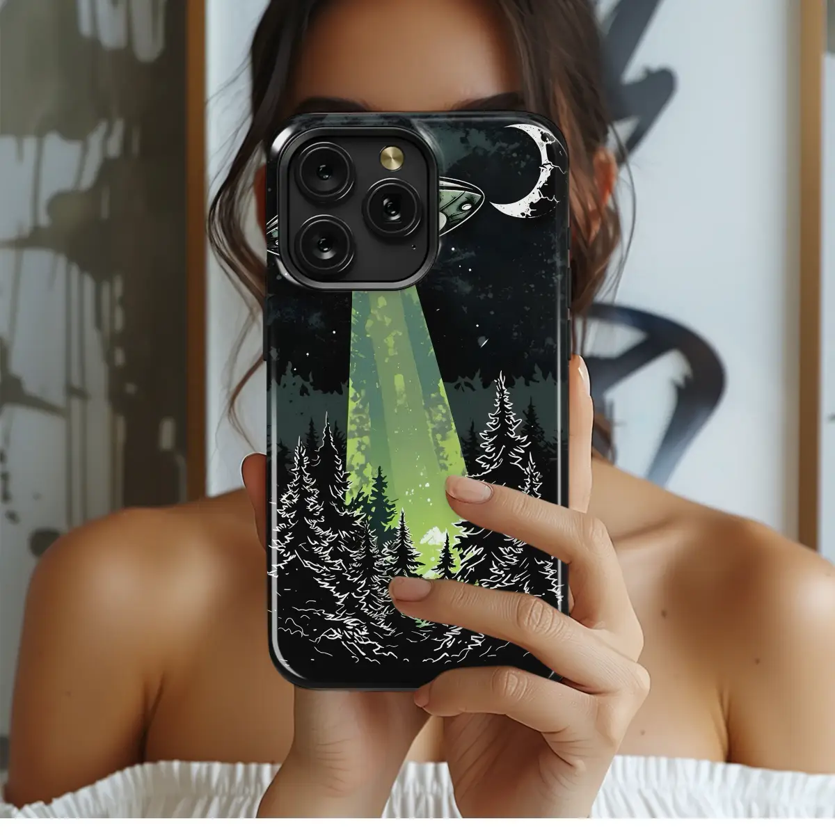 Look up and believe. In the silent depths of a midnight forest, where pine trees etch their stark, graphic silhouettes against a star-dusted, grunge-textured sky, a visitor arrives. This captivating design captures a moment of pure cosmic mystery, freezing in time the silent descent of an otherworldly craft under the watchful eye of a stark crescent moon. An ethereal green tractor beam cuts through the darkness, bathing the ancient woods in its mysterious, almost radioactive glow, hinting at secrets untold and journeys about to begin. The vintage, graphic novel aesthetic, with its bold lines and slightly weathered look, brings a cool, retro vibe to this paranormal scene, making it more than just an image—it's a complete narrative whispered from the stars. This is the perfect statement piece for the dreamer, the sci-fi enthusiast, or anyone who feels a profound connection to the vast, unknown universe. Let this powerful artwork transform your most-used essential into an emblem of your curiosity and a fantastic conversation starter. Carry a piece of the cosmos with you, a daily reminder of the magic that exists just beyond our world. It's the ultimate unique gift for the stargazer, alien believer, or conspiracy theorist in your life who appreciates bold, narrative art that truly tells a story.