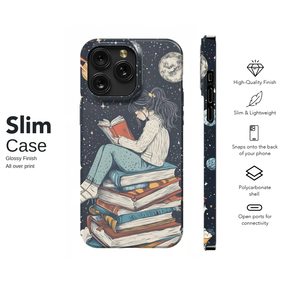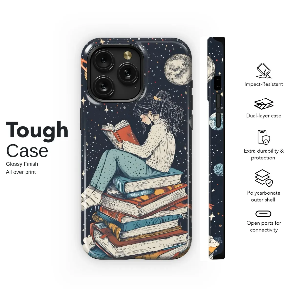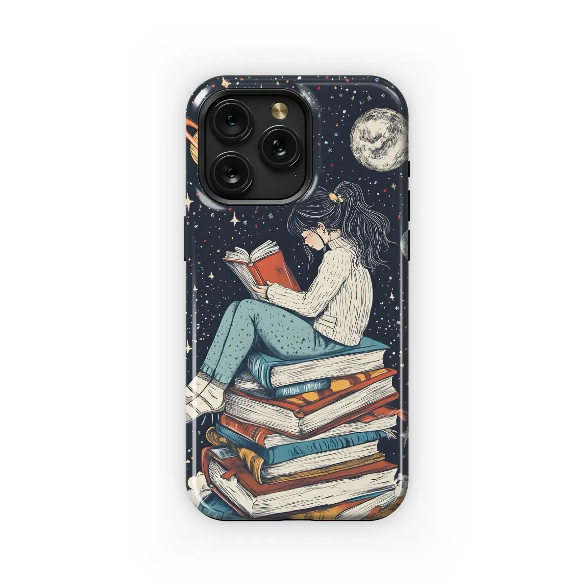 Embrace your inner bookworm with this cosmic design. A girl, lost in a captivating read, sits atop a towering stack of books, adrift in a mesmerizing galaxy of stars, planets, and swirling nebulae. This enchanting illustration evokes a sense of wonder, perfect for those who find solace in stories and the mysteries of the universe. The vibrant colors and intricate details are beautifully rendered, creating a truly unique and artistic piece. This design adds a touch of whimsical elegance and intellectual charm to your everyday essentials, turning a simple accessory into a statement of personal style and a celebration of imagination. It's a must-have for readers, dreamers, and anyone who appreciates stunning artwork. This high-quality print is vibrant, durable, and sure to be a conversation starter. Show the world your love for literature and the cosmos with this exceptional design. This makes an ideal gift for book lovers, space enthusiasts, and anyone seeking a touch of cosmic magic in their lives. #booklover #space #galaxy #cosmos #reading #books #art #illustration #design #unique #gift #aesthetic #whimsical #stars #planets #nebula #dreamy #magical