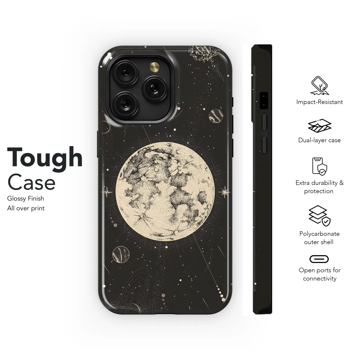 Embrace the cosmos with our captivating Cosmic Celestial Design phone case. This ethereal accessory features intricate celestial patterns that transport you to a realm of stars and galaxies. Its sleek design seamlessly protects your device, while its vibrant hues add an otherworldly touch to your everyday style.