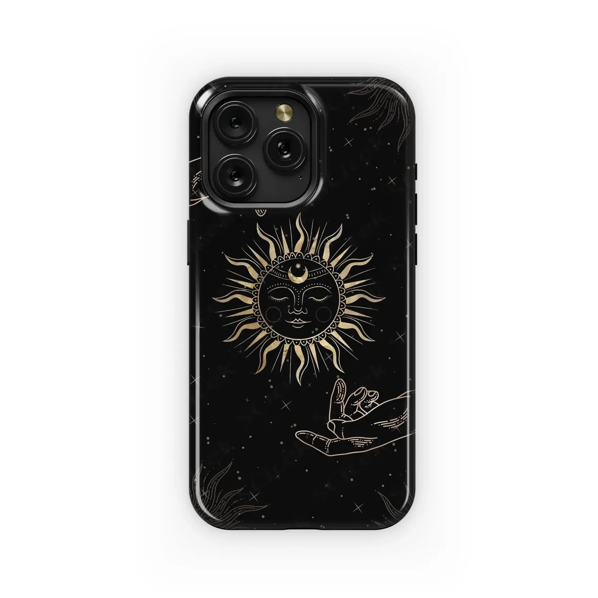 Embrace celestial style with this captivating design, featuring a serene sun face adorned with a crescent moon, encircled by radiant sunbursts. Two elegantly outstretched hands frame this celestial scene, creating a mystical and balanced composition. The rich, dark background is scattered with twinkling stars, adding depth and enhancing the overall ethereal ambiance. This striking artwork is printed with high-quality inks ensuring vibrant colors and lasting durability. Perfect for those who appreciate astrology, bohemian aesthetics, or simply crave a unique and eye-catching accessory that reflects their individuality. This design adds a touch of cosmic elegance to any personal item, making a statement wherever you go. The intricate details and luxurious color palette create a sophisticated and mysterious aesthetic, guaranteed to turn heads. Its sleek, minimalist design blends seamlessly with various personal styles, offering a versatile yet expressive option for self-expression. This artwork transforms everyday essentials into personalized works of art.