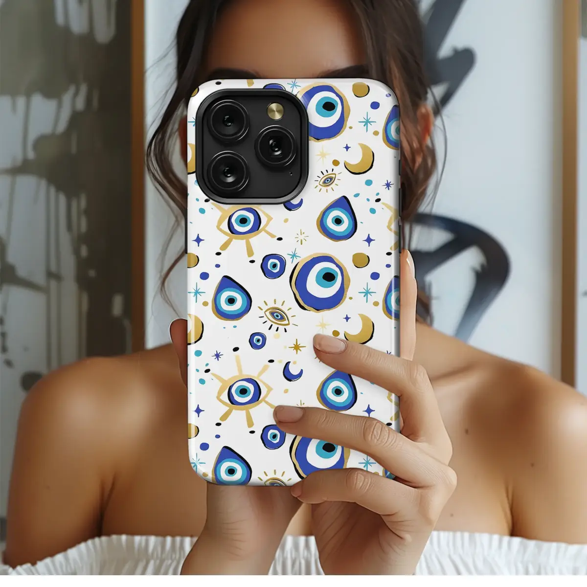 Surround your daily companion in a celestial shield of positive energy and ancient protection with this enchanting, whimsical design. Imagine a vibrant constellation of hand-painted Evil Eye talismans, each one a unique guardian artfully crafted to ward off negativity and protect your peace. Shimmering gold crescent moons and twinkling stars dance across a crisp white background, scattered amongst powerful Nazar charms in deep cobalt, royal blue, and bright turquoise. This isn't just a stylish accessory; it's a wearable piece of art that serves as your personal amulet, a bohemian statement that deflects bad vibes and invites good fortune wherever you go. The artistic, free-flowing forms give it a magical, hand-touched feel, making it the perfect spiritual gift for a best friend or a meaningful treat to elevate your own essential tech. Let this mystical pattern be a constant, beautiful reminder to trust your intuition and carry good energy with you. Wrap your most-used device in this protective embrace and turn it into a powerful talisman of style and mindfulness.