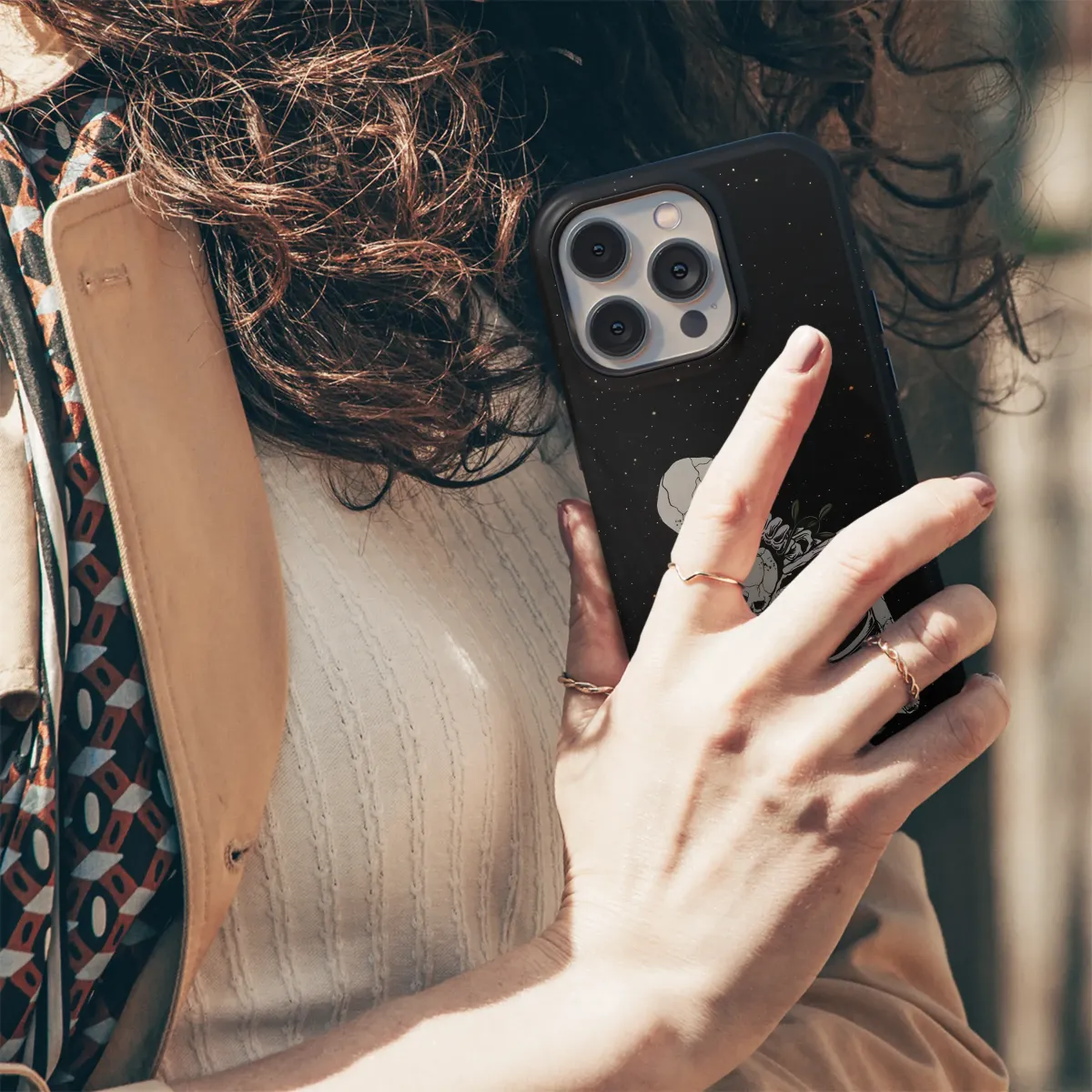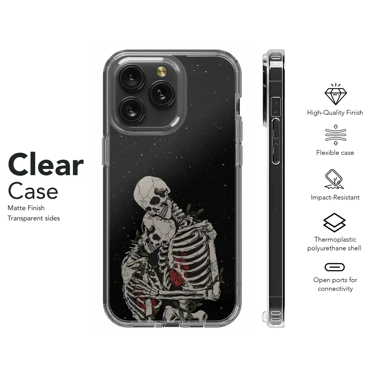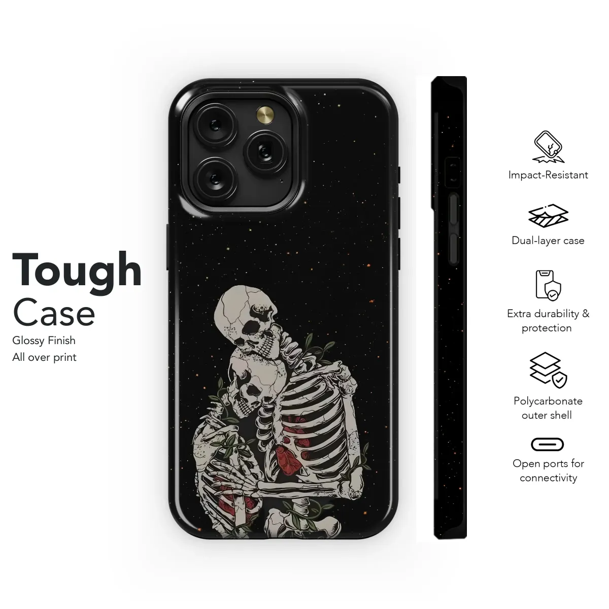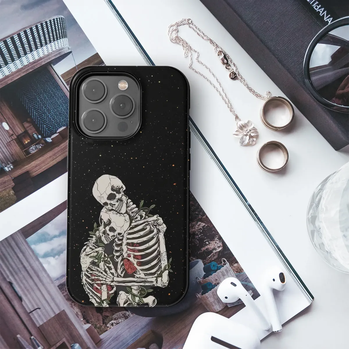 Embrace the dark romance of this captivating design, featuring two skeletons intertwined in an eternal embrace against a backdrop of a starlit night. Intricate details showcase the skeletons' delicate bones entwined with lush, dark foliage and vibrant roses blooming from their ribcages, symbolizing enduring love and the beauty found in the macabre. This gothic-inspired artwork is perfect for those who appreciate unique, edgy aesthetics and a touch of the mysterious. The high-quality print ensures vivid colors and sharp lines that will remain vibrant for years to come. This striking image is a conversation starter and a testament to your individual style, adding an element of dark elegance to your daily carry. Show off your unique personality with this darkly romantic design, perfect for adding a gothic touch to your accessories. This artistic masterpiece is guaranteed to make a statement wherever you go. Express yourself with this stunning, one-of-a-kind piece.