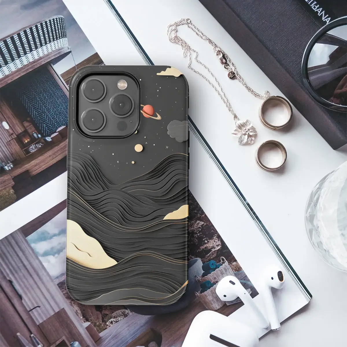 Escape into a pocket-sized universe where the cosmos meets a midnight sea. This captivating design invites you to carry a piece of celestial magic on your daily journey, transforming your most essential companion into a work of art. Imagine gazing into a velvet black expanse, where textured planets drift in a serene dance; a golden giant with sculpted stripes, a kintsugi-inspired orb fractured with precious metal, and a pop of terracotta Saturn glowing softly against the void. Shimmering gold stars and whimsical clouds float above a stunning abstract landscape of layered, paper-cut waves, each dark ripple elegantly edged in gold, creating an incredible sense of depth and tactile wonder. Perfect for the dreamer, the stargazer, or anyone who appreciates a minimalist yet profound aesthetic, this piece is a conversation starter. It’s a touch of dark academia, a whisper of witchy elegance, and a thoughtful astrology gift for the soul who finds beauty in the cosmos. Let this unique black and gold celestial scene adorn your tech, offering a constant, beautiful reminder of the vast, quiet mystery that surrounds us.