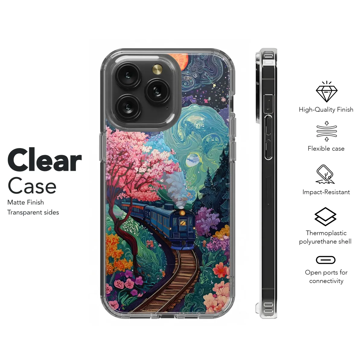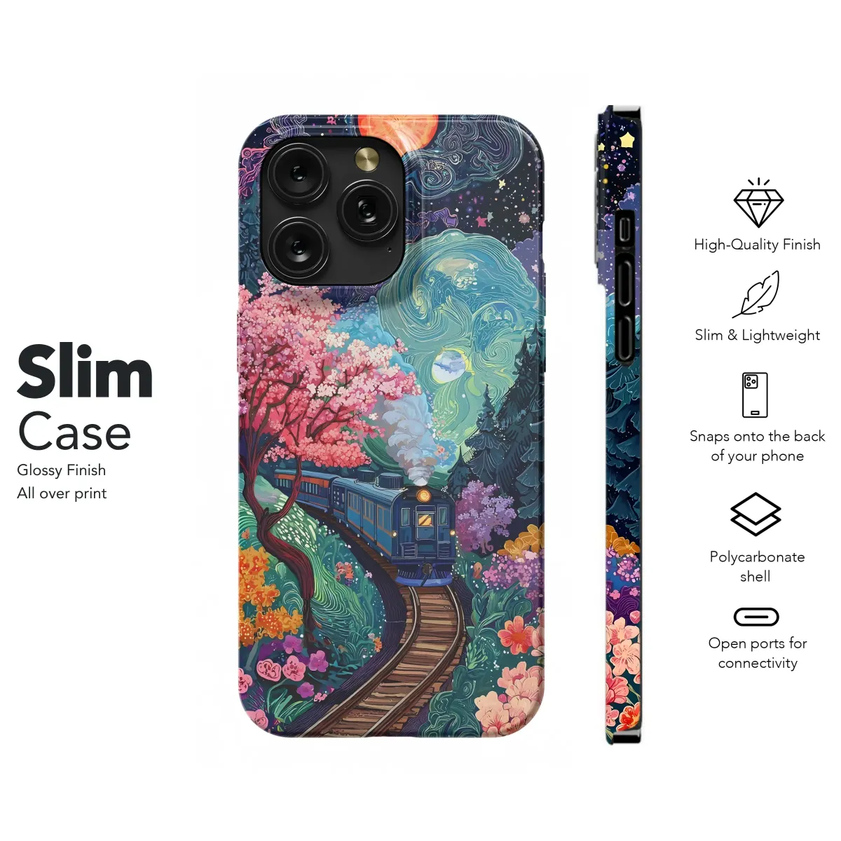 Embark on a whimsical journey with this vibrant, surreal artwork featuring a train gliding through a fantastical landscape. Bursting with color and intricate detail, this design captures the magic of a dreamlike world. Pink cherry blossoms bloom under a swirling, starlit sky, while a fiery sun and a tranquil moon illuminate the path. The rich textures and captivating colors create a mesmerizing visual experience. This high-quality print is perfect for adding a touch of imaginative artistry to your personal style and will bring a unique flair to your everyday routine. Its captivating design is sure to spark conversations and compliments, making it the ideal gift for art enthusiasts, dreamers, and those who appreciate one-of-a-kind pieces. This bold and beautiful design is printed using vibrant, long-lasting inks to ensure your artwork remains vivid and captivating for years to come. Transform your accessory into a personalized work of art—a delightful escape from the ordinary. Add a touch of magic and imagination to your life with this stunning piece!