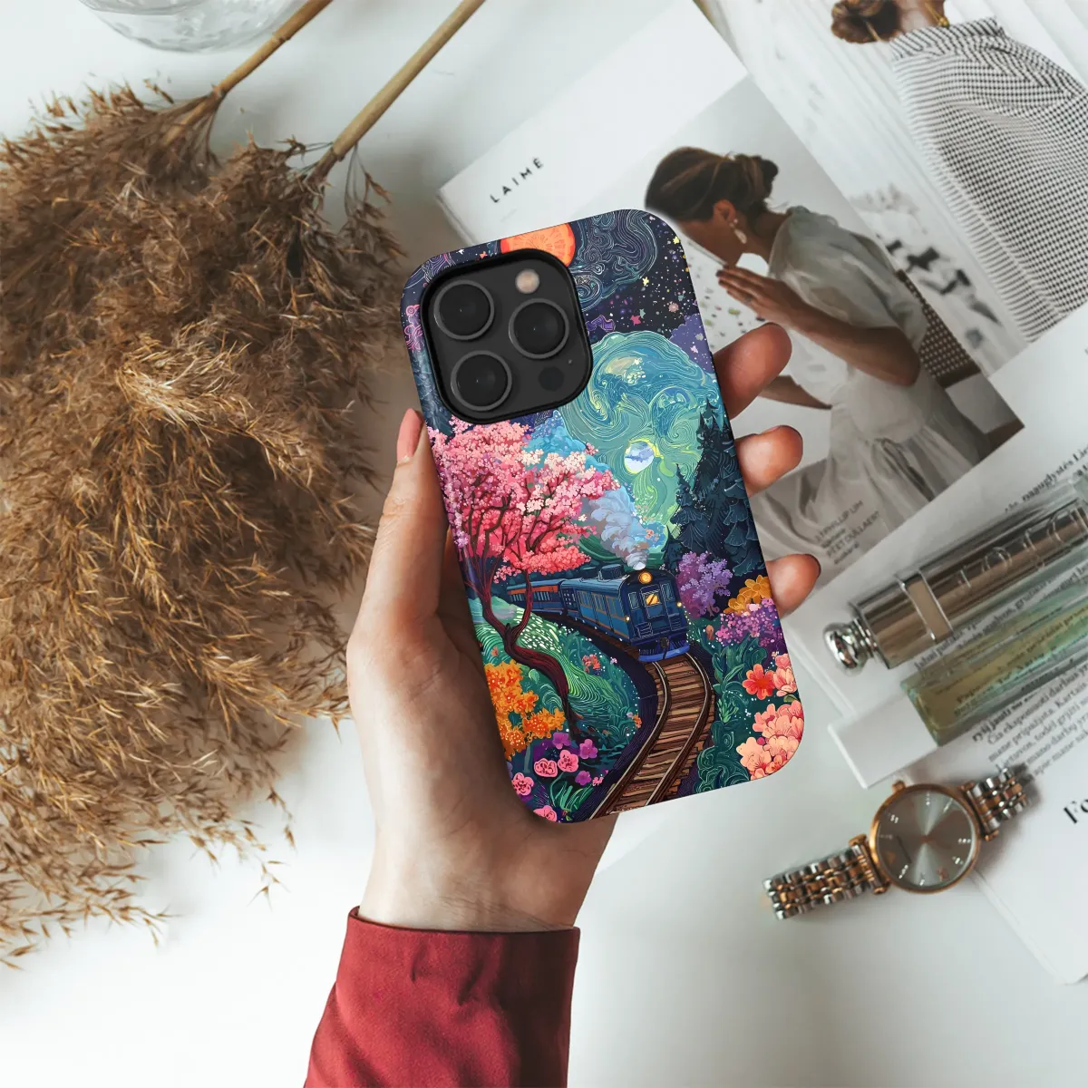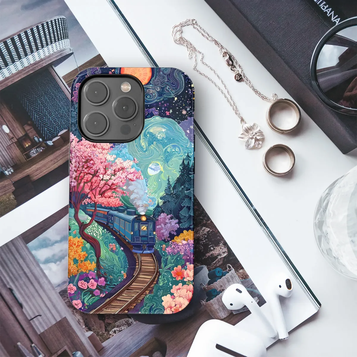 Embark on a whimsical journey with this vibrant, surreal artwork featuring a train gliding through a fantastical landscape. Bursting with color and intricate detail, this design captures the magic of a dreamlike world. Pink cherry blossoms bloom under a swirling, starlit sky, while a fiery sun and a tranquil moon illuminate the path. The rich textures and captivating colors create a mesmerizing visual experience. This high-quality print is perfect for adding a touch of imaginative artistry to your personal style and will bring a unique flair to your everyday routine. Its captivating design is sure to spark conversations and compliments, making it the ideal gift for art enthusiasts, dreamers, and those who appreciate one-of-a-kind pieces. This bold and beautiful design is printed using vibrant, long-lasting inks to ensure your artwork remains vivid and captivating for years to come. Transform your accessory into a personalized work of art—a delightful escape from the ordinary. Add a touch of magic and imagination to your life with this stunning piece!