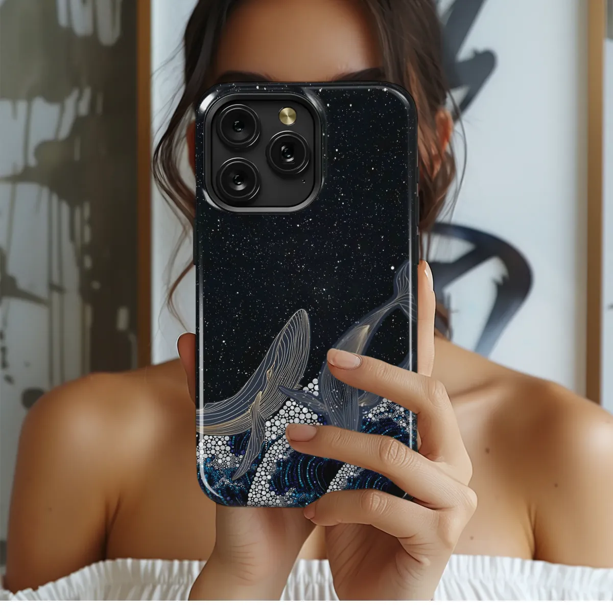 Elevate your style with this mesmerizing design featuring two graceful whales breaching the waves under a starlit sky. The intricate detail of the whales, rendered in elegant gold lines against a deep navy backdrop, is beautifully complemented by the shimmering, pointillist ocean, creating a captivating visual narrative. This artistic print is a testament to the beauty of nature and the boundless expanse of the cosmos, transforming your device into a personal work of art. The rich color palette and unique design are sure to turn heads and spark conversation, reflecting your sophisticated taste and appreciation for exceptional aesthetics. This makes a stunning gift for ocean lovers, astronomy enthusiasts, and anyone who appreciates unique and eye-catching designs. It adds a touch of magic and wonder to your daily life, ensuring that your device is as captivating as you are. Perfect for expressing your individuality and adding a touch of artistic flair to your accessories. Choose your preferred protective layer for optimal durability and long-lasting beauty. This design is guaranteed to bring a sense of wonder and tranquility to your everyday essentials, transforming them into a stylish statement piece.