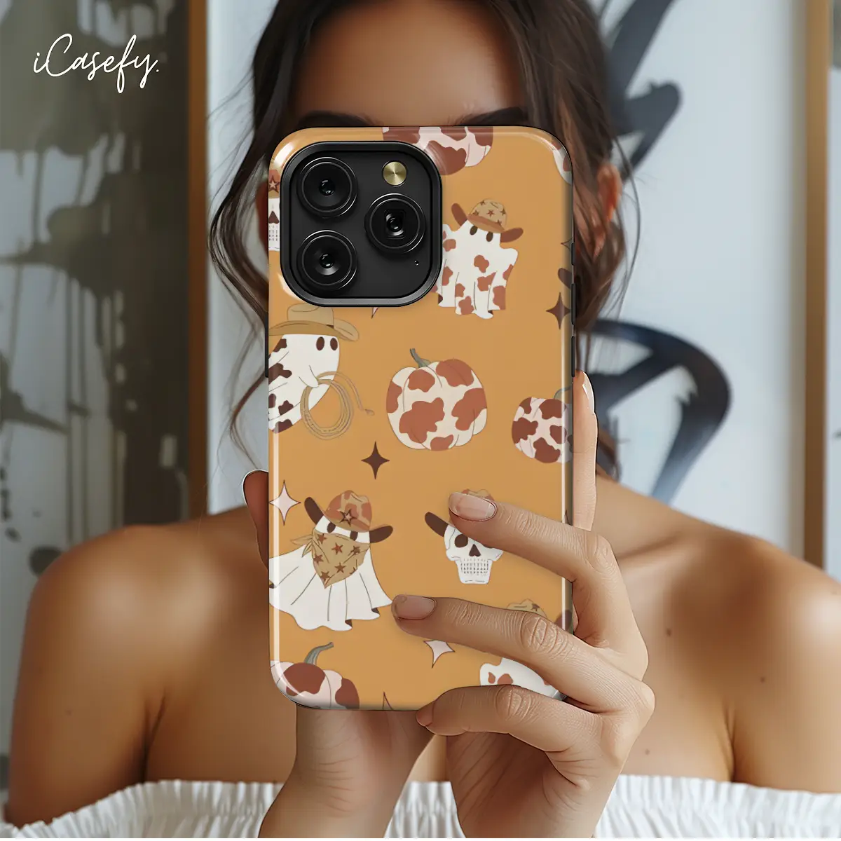 Howdy partner! Get your hands on this rootin' tootin' phone case featuring a spooky cow print and a quartet of ghastly ghosts. Perfect for wranglin' up likes on social media or just keepin' your phone safe from varmints.
