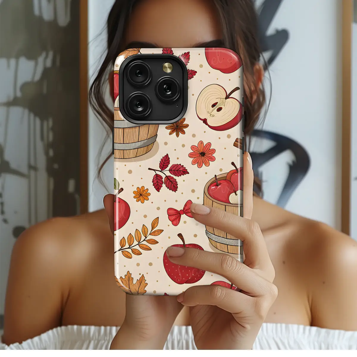 Wrap your daily essentials in the heartwarming embrace of a perfect autumn day with this delightfully illustrated design. Imagine wandering through a sun-drenched orchard, the air crisp and fragrant with the sweet scent of ripe, red apples. This charming pattern perfectly captures that magical, cozy feeling, featuring rustic wooden barrels overflowing with the season's finest harvest, scattered alongside aromatic cinnamon sticks and delicate star anise that hint at freshly baked pies. Warm-hued autumn leaves in shades of amber and crimson tumble gracefully, mingling with tiny orange blossoms and whimsical red bows that add a touch of sweet nostalgia. This artwork is a true celebration of the harvest season, evoking the simple joy of apple picking and the comfort of a warm kitchen. Every glance reveals a new delightful detail—a juicy apple sliced to reveal its core, a delicate butterfly fluttering by—all set against a creamy, subtly polka-dotted backdrop. It’s more than just a beautiful pattern; it’s a piece of cottagecore charm that brings the rustic elegance and cozy spice of fall into your hands. Let this unique artwork be the perfect accessory to complement your fall aesthetic, a daily reminder of nature’s sweet and spicy bounty that brightens every moment.
