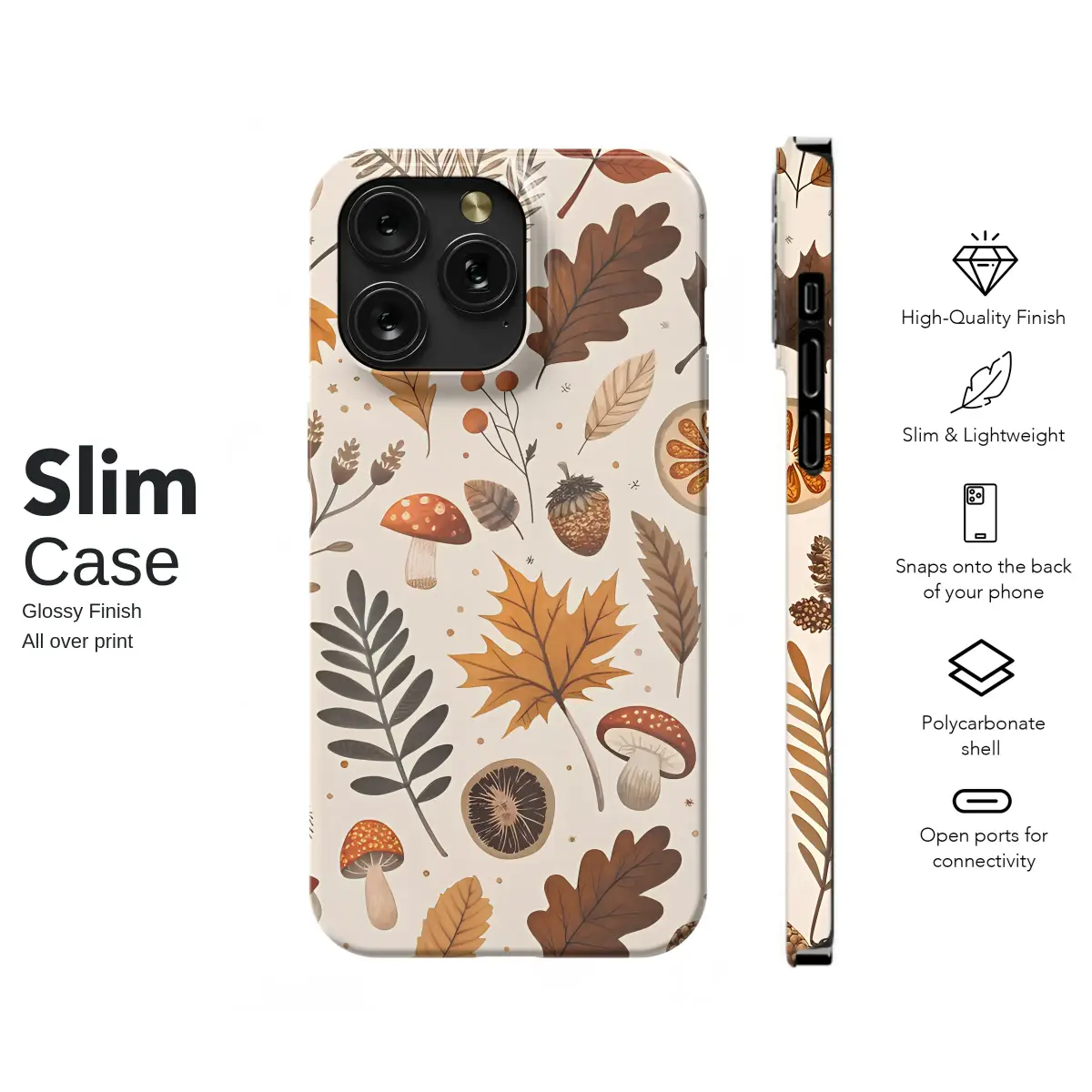 Embrace the enchanting spirit of the season with this beautifully illustrated design, a tribute to the cozy magic of a crisp autumn day. Wander through a whimsical woodland where a tapestry of nature's treasures unfolds. Rich, earthy tones of burnt sienna, deep ochre, and warm terracotta paint a picture of falling leaves, from delicate maple to sturdy oak. Discover charming, spotted mushrooms nestled amongst detailed acorns, clusters of ruby-red berries, and rustic pinecones, as if freshly gathered from the forest floor. This delightful botanical pattern captures the essence of a tranquil walk in the woods, with every element meticulously drawn to evoke a sense of warmth and nostalgia. It’s a perfect piece of cottagecore art for anyone who adores the harvest season and the simple beauty of the outdoors. Let this design wrap your favorite accessory in the comforting embrace of fall, turning an everyday essential into a unique statement of your love for nature. It's an ideal seasonal accent or a thoughtful gift for the nature lover in your life, bringing a touch of rustic charm and autumnal aesthetic wherever you go. Carry a piece of the serene forest with you and let its gentle, artistic vibe brighten your daily routine.