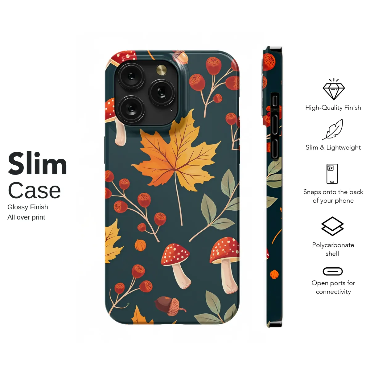 Step into a world where the air is crisp and the forest floor is a tapestry of autumnal wonders. This enchanting design captures the very heart of the season, scattering vibrant golden-orange maple leaves across a deep, moody teal canvas, creating a stunning visual contrast that feels both cozy and sophisticated. Hidden amongst the falling foliage, you'll discover charming red-and-white toadstools, whimsical mushrooms that add a touch of fairytale magic to the scene. Look closer and you'll find plump little acorns just waiting to be gathered and delicate clusters of rich crimson berries adding a pop of vibrant color. The rich, warm palette evokes the feeling of a cozy sweater, a warm drink, and a leisurely stroll through a sun-dappled woodland. It's a celebration of nature's simple gifts and the magical transition of the seasons, perfect for anyone who adores cottagecore charm, whimsical illustration, or the deep, comforting aesthetic of a forest in fall. Let this beautiful pattern bring a piece of the enchanted woods into your daily life, a constant reminder of the cozy, magical feeling of autumn's embrace.