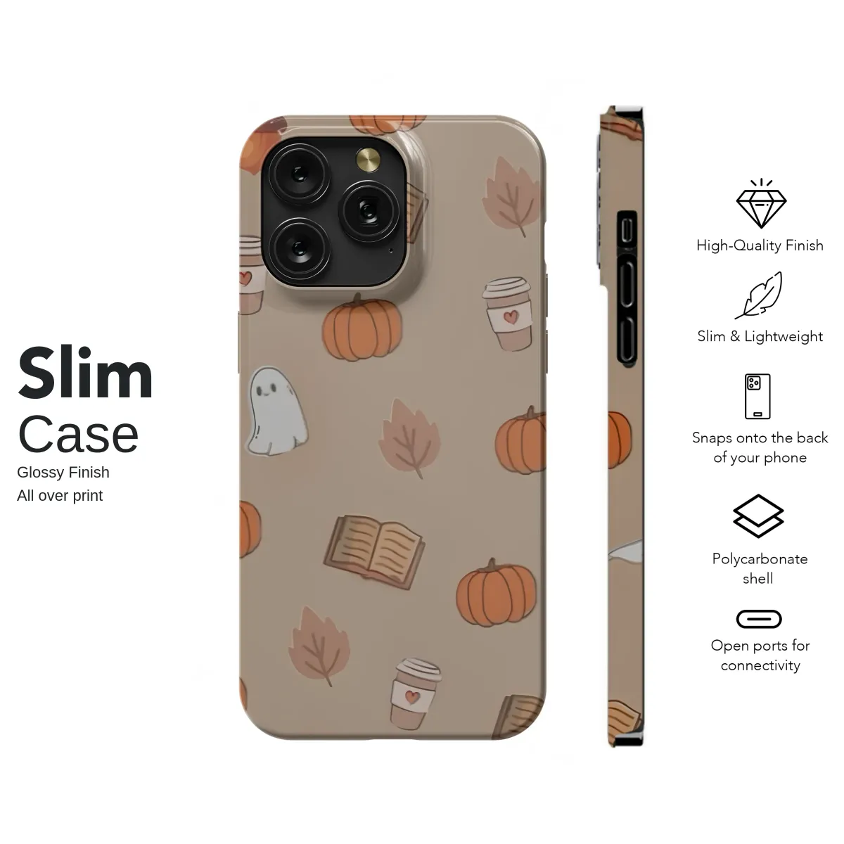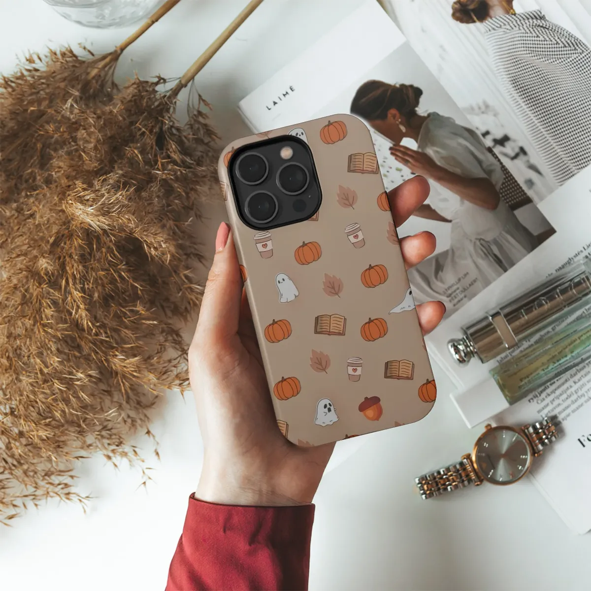 Wrap yourself in the magical feeling of a crisp autumn afternoon with this enchanting design. Picture this: you're settled into your favorite reading nook, a warm pumpkin spice latte in hand, as friendly little ghosts playfully float among scattered pumpkins and rustling fall leaves. This captivating pattern captures the very heart of the cozy season, beautifully blending the whimsical fun of Halloween with the serene comfort of a well-loved book. Each delightful illustration, from the cheerful orange pumpkins and tiny acorns to the charmingly spooky spirits, dances across a soft, neutral taupe background. The warm, earthy color palette evokes golden hour light and the changing colors of the forest. This design is a love letter to chilly days, hot coffee, and the simple joy of getting lost in a story. It's the perfect aesthetic for any book lover, coffee aficionado, or anyone who believes that autumn is not just a season, but a feeling. Let this sweet and spooky cottagecore artwork bring a touch of whimsical charm to your daily essentials, making every glance a perfect reminder of your favorite time of year.