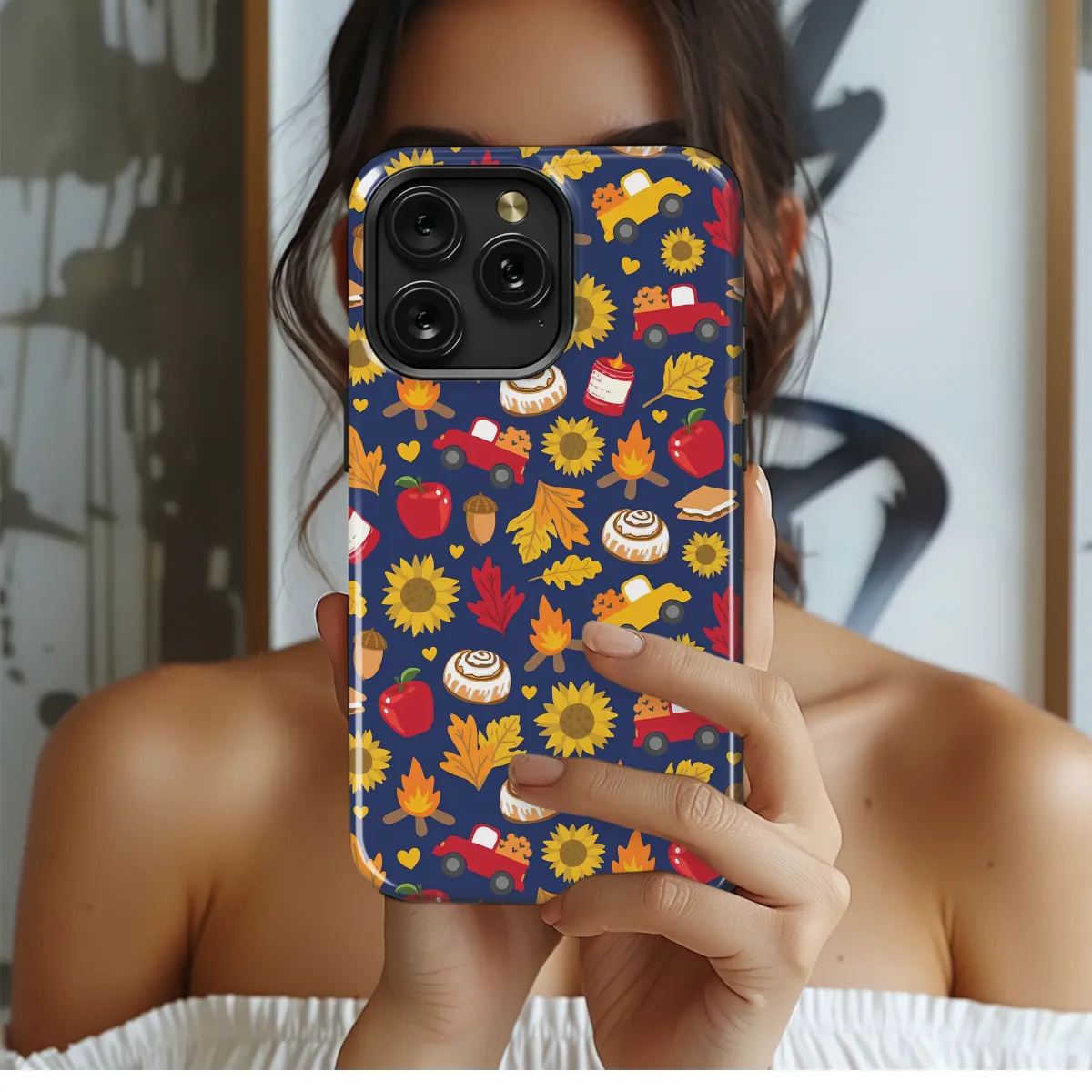 Wrap your world in the warm, nostalgic embrace of autumn with this enchanting illustrated design, a vibrant celebration of all things cozy and sweet. Feel the crispness in the air as you gaze upon a pattern brimming with the simple joys of the season. Picture a perfect fall day: a crackling bonfire radiates warmth, the sweet aroma of freshly baked cinnamon rolls fills the air, and cheerful sunflowers turn their faces towards the golden sun. This whimsical collage captures the heart of harvest time, with classic red trucks carrying precious cargo, juicy red apples ready for picking, and delicious s'mores just waiting to be toasted by the fire. Scattered amongst the golden and crimson leaves are tiny acorns and sweet little hearts, adding a touch of playful charm to the entire scene. It’s more than just a pattern; it’s a feeling. It's the comfort of a spiced candle, the joy of a hayride, and the magic of a starlit bonfire night. Carry this delightful artwork with you as a personal accessory and let it be a constant, cheerful reminder of your favorite season. An ideal piece for anyone who lives for pumpkin patches and crunchy leaves, this design makes a thoughtful gift for the ultimate autumn lover, enveloping their everyday essentials in the undeniable magic of fall.