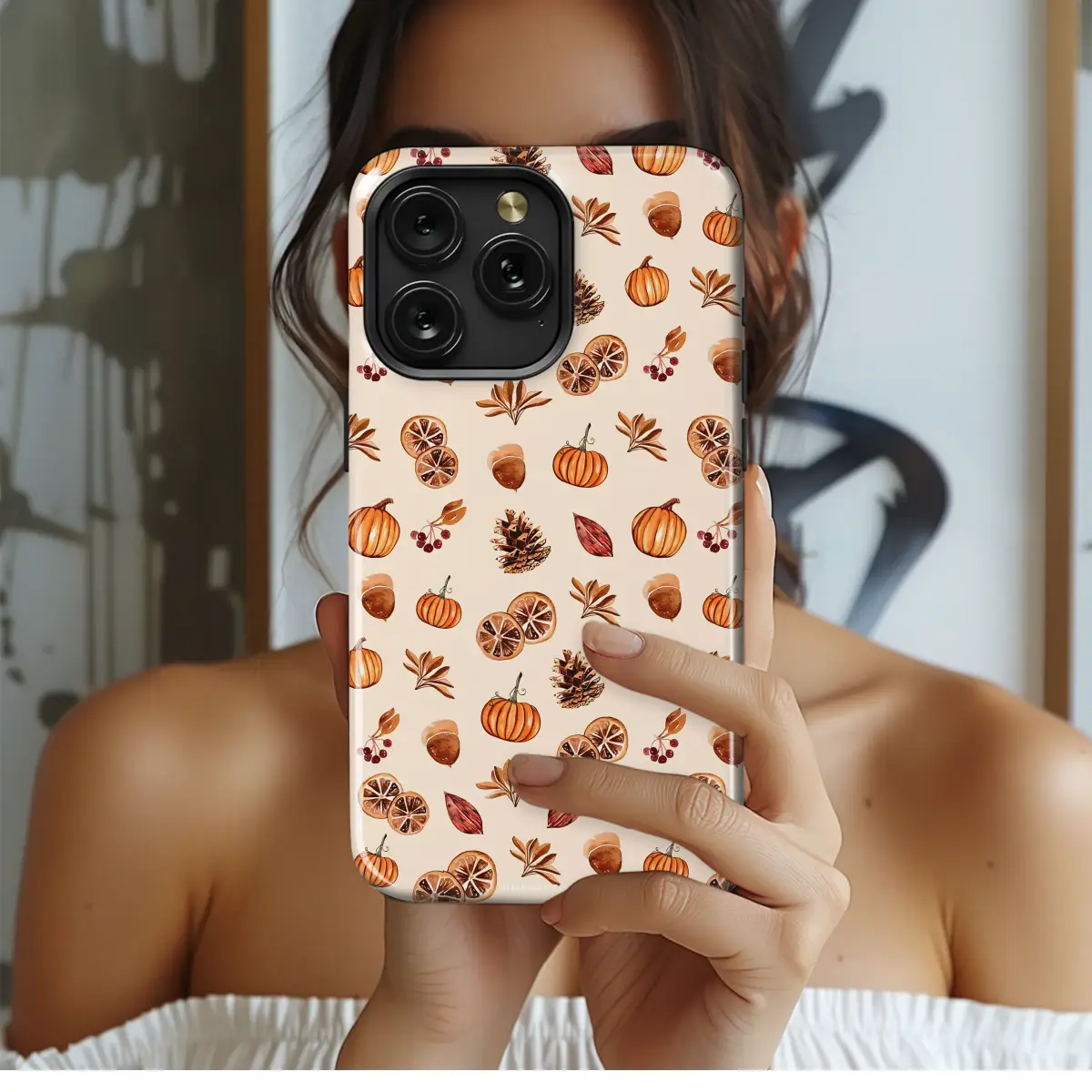 Wrap your most essential accessory in the warm, golden embrace of the harvest season. This charming, artist-created watercolor design captures the very essence of a crisp autumn day, bringing a touch of rustic elegance to your daily routine. Delight in the beautifully illustrated medley of plump orange pumpkins, earthy acorns, intricate pinecones, and fragrant slices of dried orange, each with delicate, painterly details. Sprigs of rich, crimson berries and delicate fallen leaves are scattered artfully across a warm, creamy background, creating a pattern that feels both nostalgic and timeless. Each element is rendered in a soft, glowing palette of terracotta, amber, and deep sienna, evoking the cozy feeling of sweater weather, the scent of spice in the air, and the satisfying crunch of leaves underfoot. This botanical artwork is perfect for anyone who adores the cottagecore aesthetic, cherishes nature-inspired art, and lives for the magic of fall. Let this beautiful piece of seasonal art accompany you, adding warmth and whimsical charm to your personal style. It’s a wonderful way to carry the spirit of Thanksgiving and the beauty of the outdoors with you, making it an ideal gift for a friend or a special treat to celebrate your favorite time of year.