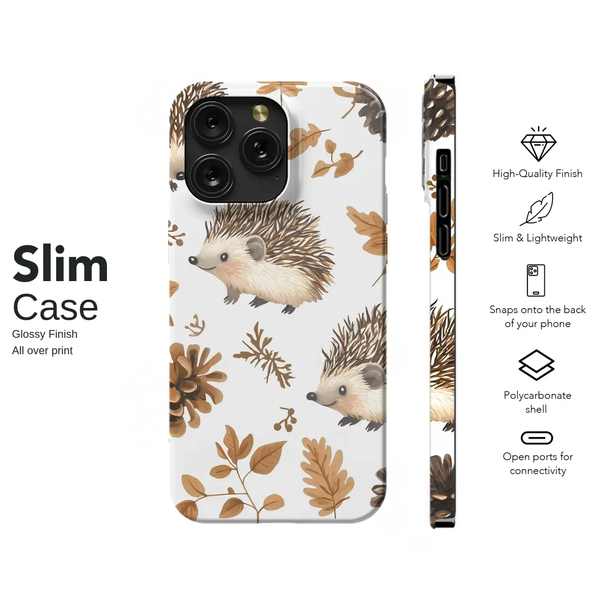 Step into a whimsical woodland scene where the crisp magic of autumn comes to life. This enchanting design captures the heartwarming charm of sweet-faced hedgehogs exploring a forest floor scattered with natural treasures. Each little creature is rendered with a soft, hand-painted feel, their gentle expressions adding a touch of personality and warmth. They wander amongst a beautiful collection of earthy pinecones, delicate oak leaves in rich browns and ochres, and rustic sprigs, all set against a clean, bright background that makes the warm colors pop. This pattern evokes the feeling of a cozy walk through the woods on a cool fall day, a perfect accessory for anyone who adores cottagecore aesthetics and the simple beauty of nature. It’s a celebration of woodland life, ideal for the nature lover, the animal enthusiast, or anyone looking to carry a piece of forest serenity with them. A truly thoughtful and charming gift that brings a daily dose of cozy, rustic elegance to your everyday essentials.