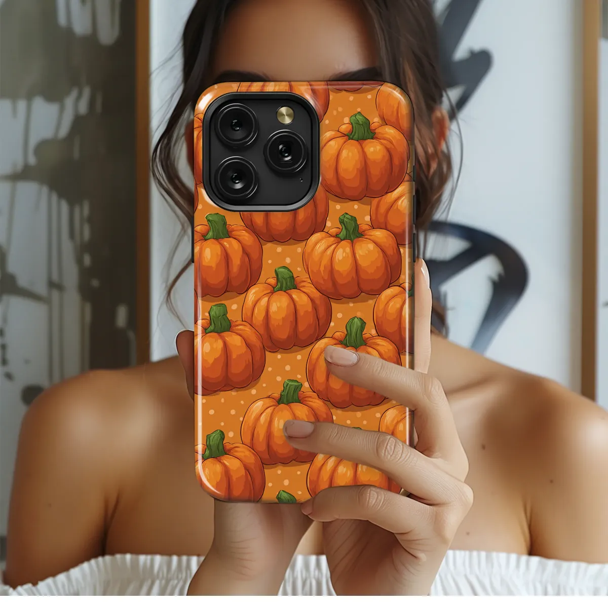 Embrace the magical spirit of autumn with this enchanting pumpkin patch artwork, a vibrant celebration of the coziest season of all. Wrap your favorite accessory in the warmth of a fall harvest, capturing the feeling of crisp golden afternoons and the sweet scent of spiced lattes. This delightful pattern features a cheerful scattering of plump, happy pumpkins in rich shades of sunset orange, each with a quirky green stem that adds a pop of life. They dance across a warm, polka-dotted background, reminiscent of confetti at a joyous harvest festival. It's more than just a design; it's an emotion—the comfort of a knitted sweater, the satisfying crunch of fallen leaves, and the happy glow of a carved jack-o'-lantern on a cool evening. This artwork perfectly captures the playful spirit of Halloween and the grateful heart of Thanksgiving, making it the ultimate personal touch to complement your seasonal style. Let this charming pumpkin art add a touch of rustic elegance and whimsical fun to your daily essentials. It’s an ideal way to express your love for all things autumn, from hayrides to bonfires, and makes a thoughtful gift for any fall enthusiast looking to sprinkle a little pumpkin spice magic into their everyday life.