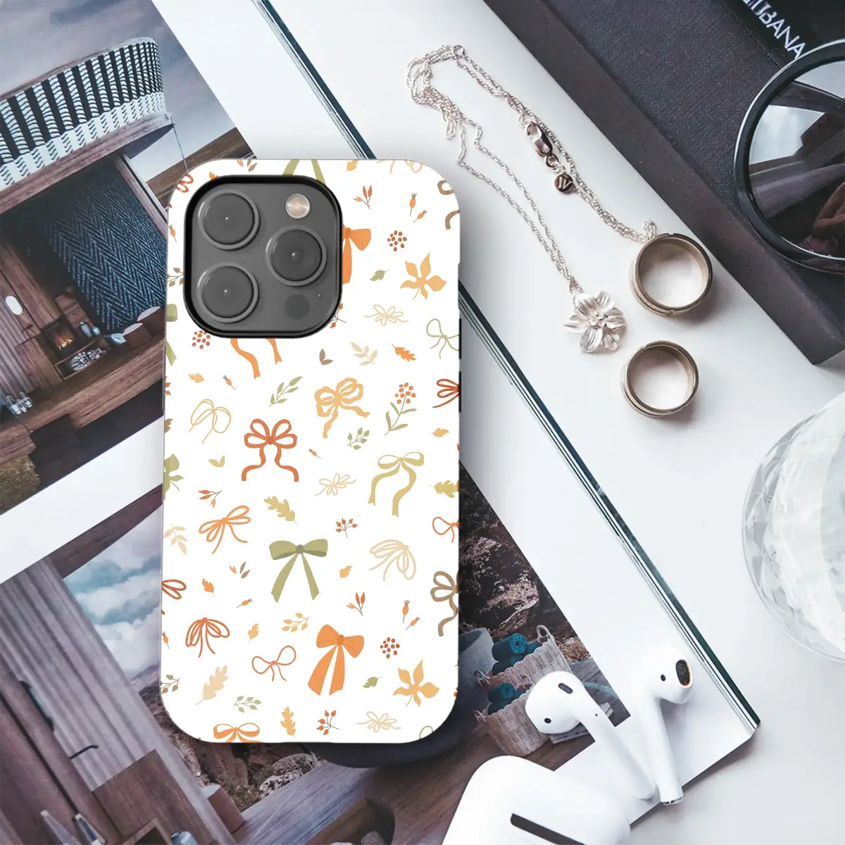 Embrace the cozy spirit of the season with this enchanting autumnal design. Imagine crisp autumn air, the gentle rustle of falling leaves, and the simple joy of tying a perfect bow. This whimsical pattern captures that feeling, with a delightful dance of rustic ribbons, delicate leaves, and tiny clusters of berries scattered across a clean, bright background. Rendered in a warm, earthy palette of burnt orange, olive green, deep russet, and soft gold, this artwork evokes the feeling of a leisurely stroll through a sun-dappled forest. It’s a touch of cottagecore charm, a whisper of bohemian spirit, and a celebration of nature's simple gifts. Let this beautiful design wrap your favorite accessory in the warmth and charm of fall, adding a unique, artistic touch to your daily essentials. It’s the perfect way to carry a piece of the harvest season with you, a subtle yet stylish nod to pumpkin spice lattes, cozy sweaters, and all the wonderful things that make autumn magical. This nature-inspired piece is an ideal gift for anyone who adores the fall aesthetic or wants to add a touch of handcrafted elegance to their everyday style.