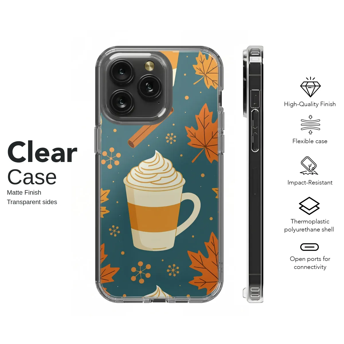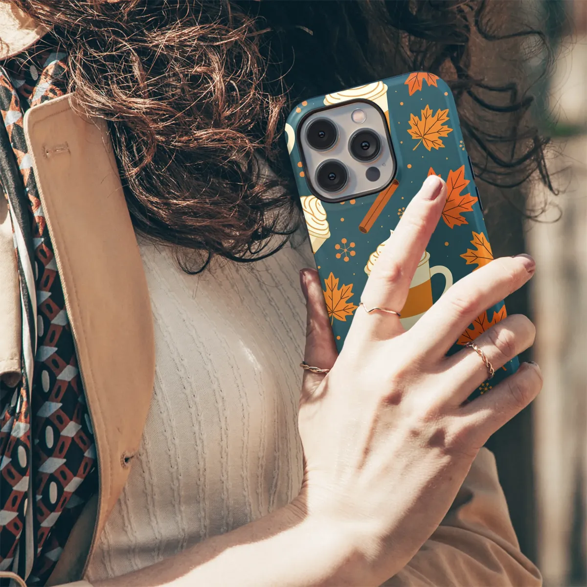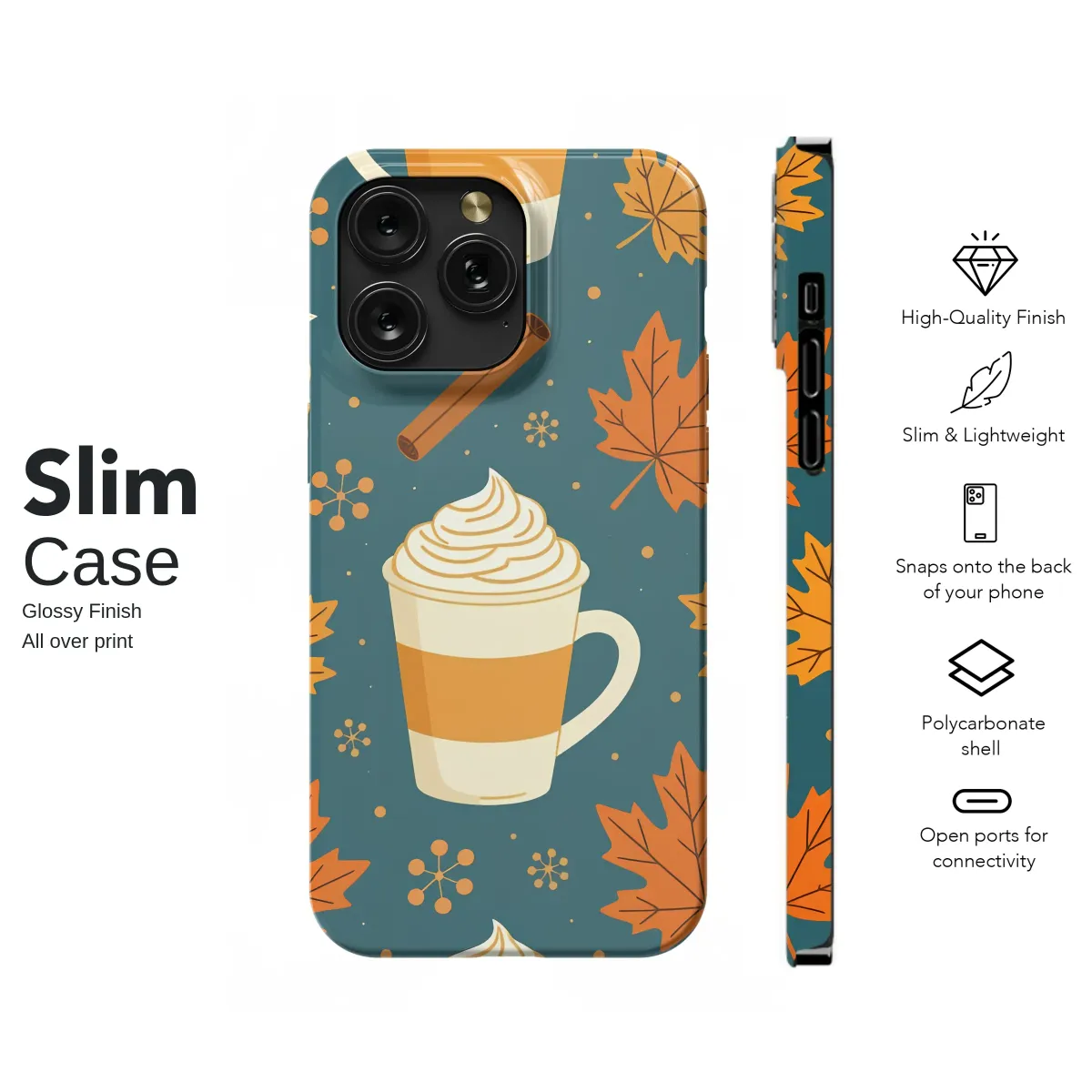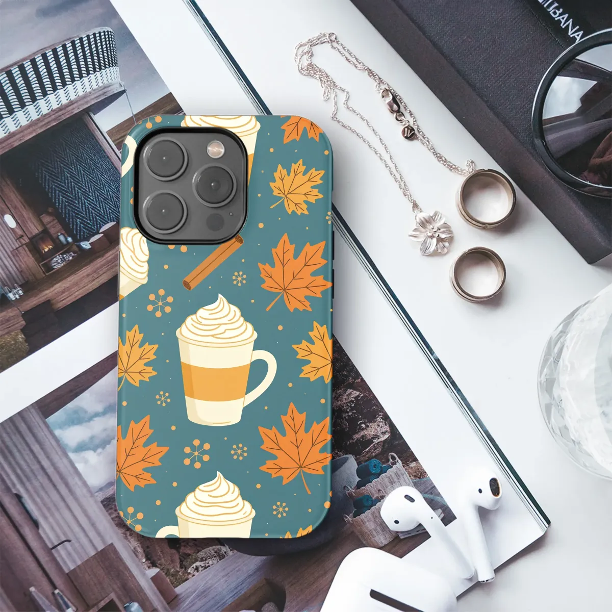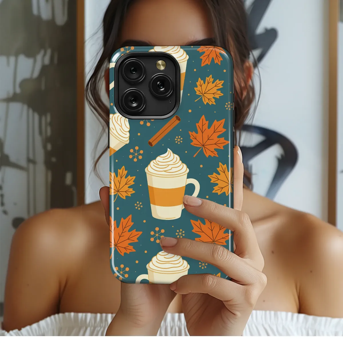 Embrace the ultimate comfort of autumn with this enchanting design, a warm hug for your most-used accessory. Picture crisp, golden mornings, the air filled with the sweet and spicy aroma of cinnamon and pumpkin, as vibrant maple leaves drift gently down from the trees. This pattern perfectly captures that cherished moment, featuring delightful mugs of creamy lattes topped with generous swirls of whipped cream, scattered among rich orange foliage and aromatic cinnamon sticks. Set against a deep, cozy teal background, the warm orange and cream tones pop, creating a visually stunning aesthetic that celebrates everything you love about the season. It’s more than just a beautiful illustration; it’s a daily reminder of sweater weather, warm drinks, and the simple, heartwarming joys of fall. An ideal choice for the dedicated coffee lover, the autumn enthusiast, or anyone looking to add a touch of seasonal charm to their daily style. Let this delightful artwork bring a smile to your face and a bit of cozy comfort to your hand, making every glance a small, joyful escape into your favorite time of year. It’s the perfect treat for yourself or a thoughtful gift for a fellow fall aficionado.