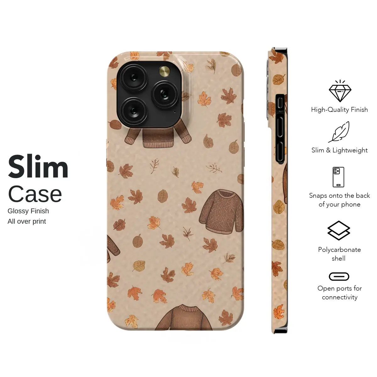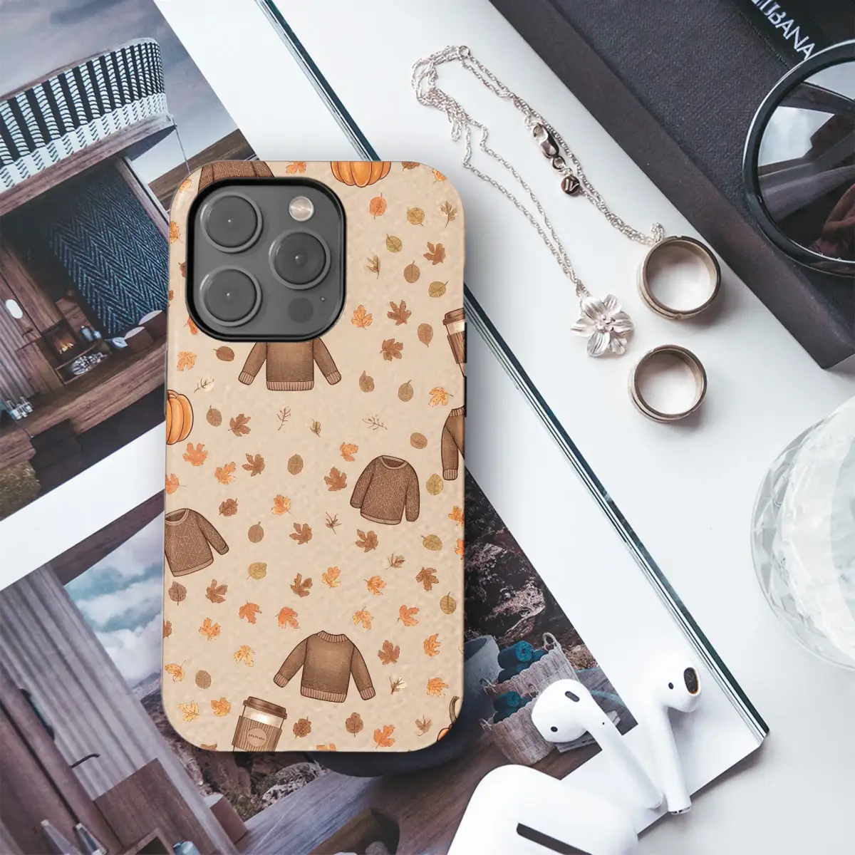 Wrap yourself in the heartwarming embrace of autumn with this enchanting illustrated design, a perfect tribute to the coziest season of all. Picture this: the air turns wonderfully crisp, and you're bundled in your favorite chunky knit sweater, a warm pumpkin spice latte steaming gently in your hands. This charming pattern captures that perfect fall moment, scattering cozy brown sweaters, vibrant orange pumpkins, and a flurry of delicate autumn leaves across a warm, textured, earthy background. Every single glance is a sweet reminder of golden afternoons spent walking through parks, the gentle rustle of foliage underfoot, and the comforting, nostalgic scent of seasonal spices. The rich, neutral color palette of warm browns and soft oranges brings a touch of rustic elegance and cottagecore charm to your daily essentials, making it a subtle yet beautiful statement piece. It’s more than just a pretty design; it's a tangible feeling—a little piece of hygge you can carry with you, celebrating the simple joys of sweater weather. Let this lovely artwork adorn your favorite accessory, keeping the spirit of the coziest season alive every day.