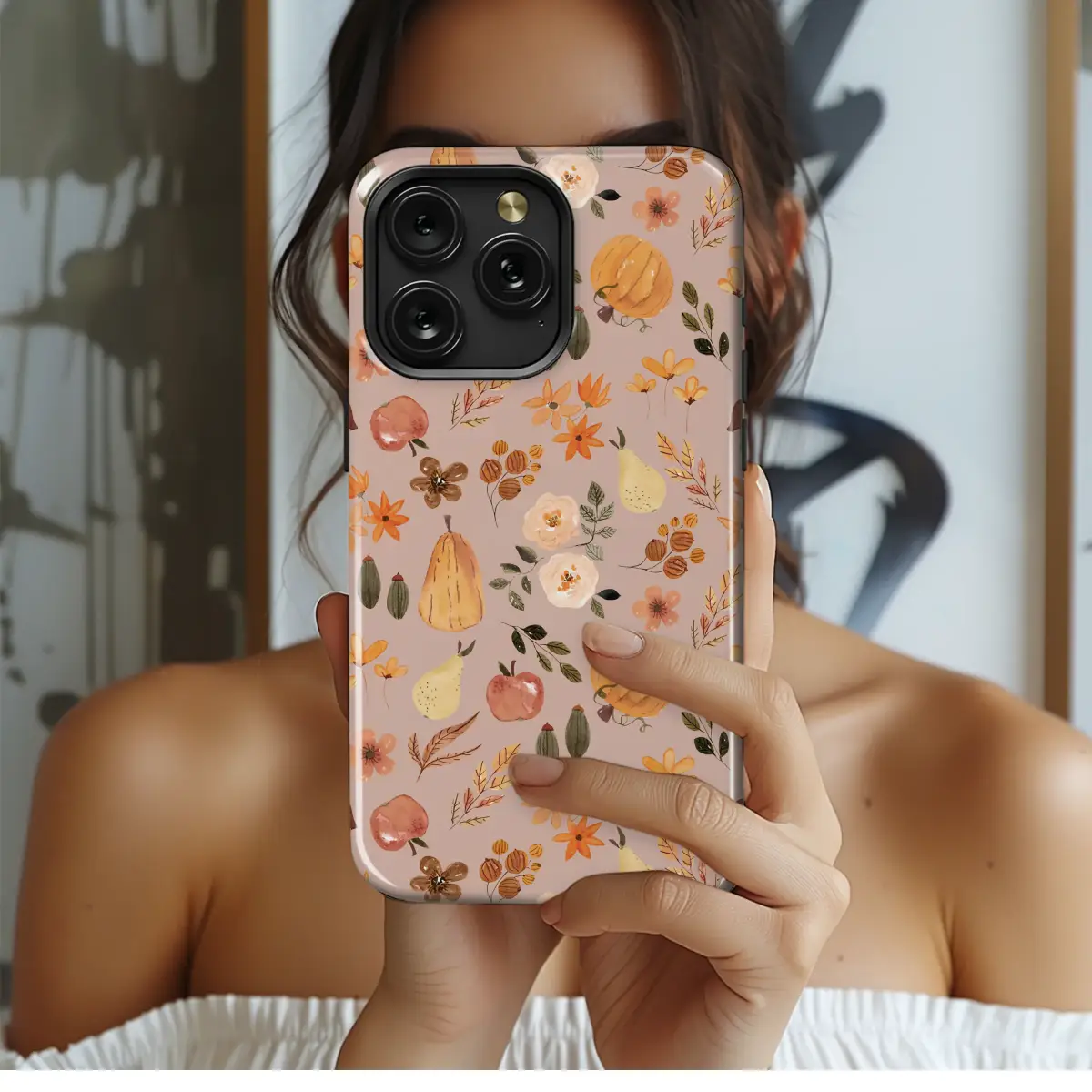 Wrap your everyday essential in the warm, gentle embrace of autumn with this breathtaking watercolor design. Take a visual stroll through a sun-dappled orchard, where the air is crisp and filled with the sweet scent of ripe apples and juicy pears. This charming pattern captures that cozy feeling perfectly, featuring a delightful harvest of hand-painted pumpkins, plump fruits, and delicate fall botanicals scattered artfully across a warm blush background. Each element, from the creamy white roses and rustic orange wildflowers to the earthy mushrooms and deep green leaves, is rendered in a soft, dreamy watercolor style that evokes a sense of handcrafted beauty. This artwork is more than just a pattern; it's a piece of cottagecore magic, a slice of harvest-time bliss that brings the comforting spirit of the season right to your fingertips. It’s the perfect aesthetic touch for anyone who adores pumpkin spice lattes, the crunch of fallen leaves, and the golden light of a fall afternoon. Let this beautiful autumn harvest art be a daily reminder of nature's simple elegance, adding a touch of artistic charm and rustic warmth to your most important accessory.