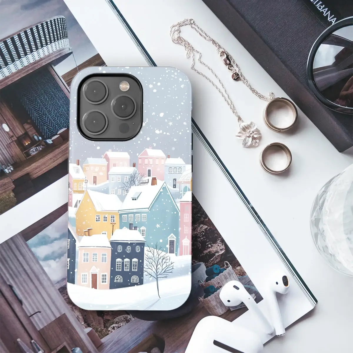 Step into a serene winter wonderland with this enchanting illustrated artwork, a perfect escape into a world of quiet charm. A picturesque village rests peacefully under a gentle cascade of snowflakes, its rooftops and streets draped in a soft, pristine blanket of fresh snow. A delightful palette of pastel pinks, soft blues, warm yellows, and deep navy brings the cozy houses to life, each one a unique gem nestled on the snowy hillside, exuding a welcoming vibe. This scene beautifully captures the quiet magic of a winter's day, evoking a profound feeling of warmth, comfort, and the Danish concept of hygge. Imagine the soft glow from within these whimsical homes, a beautiful contrast to the cool, crisp air of the winter landscape. This design is a celebration of simple joys and the tranquil beauty of the holiday season, transforming your everyday item into a portal to a picturesque Scandinavian town. Let this piece bring a touch of storybook charm and peaceful winter aesthetic into your daily life, constantly reminding you of cozy evenings, the gentle hush of falling snow, and the unique magic hidden in the quietest moments. It’s more than just a design; it’s a tranquil, snowy dreamscape you can carry with you.