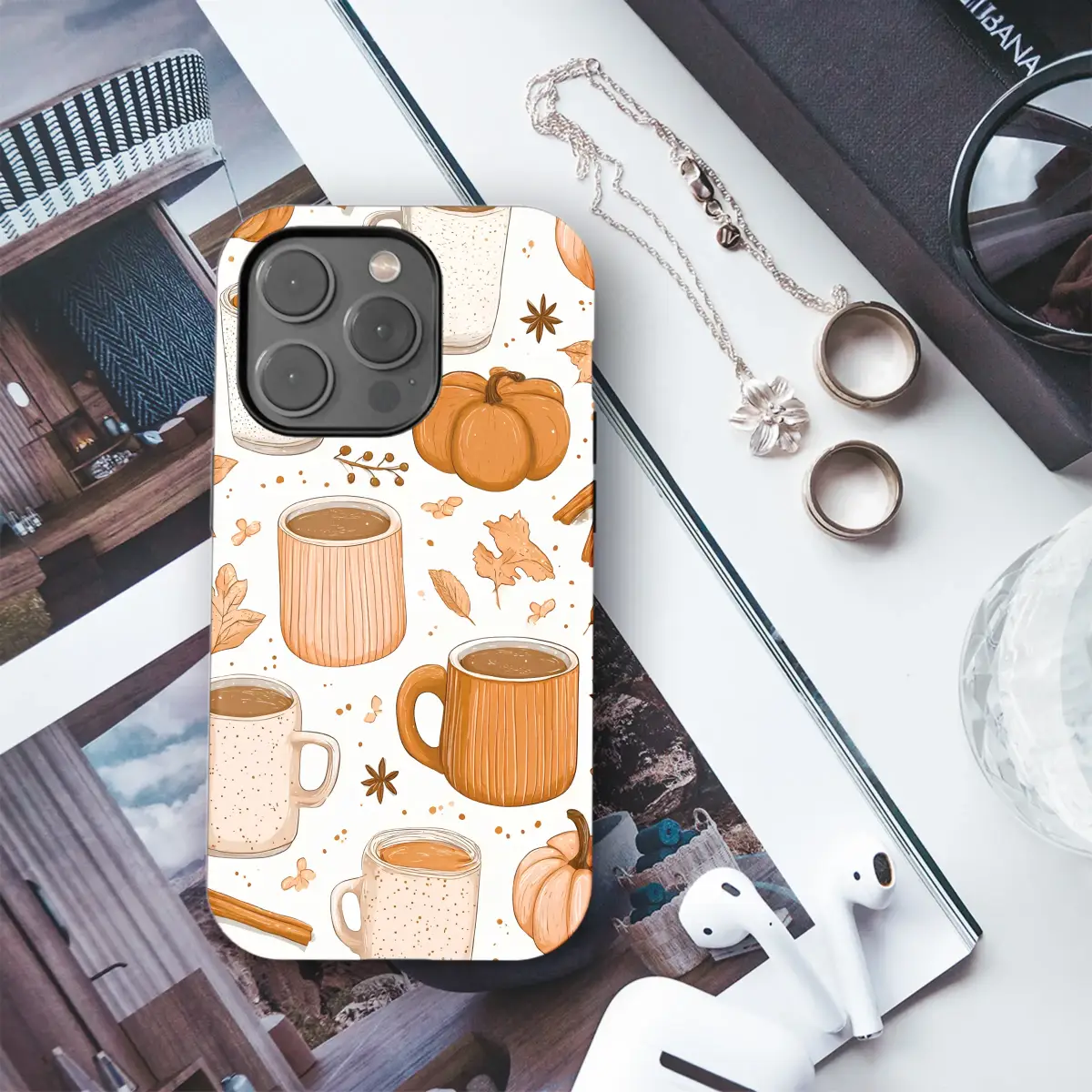 Embrace the coziest season of all and wrap your most-used essential in the warm hug of autumn. Our delightful Pumpkin Spice Comfort design captures that perfect, crisp fall morning feeling, turning your daily companion into a piece of art that celebrates sweater weather. Imagine the sweet, spicy scent of a pumpkin spice latte brought to life in a charming, hand-drawn illustration. This beautiful pattern features an array of steaming mugs—some speckled, some ribbed, each with a warm, hand-thrown pottery feel—brimming with creamy lattes and rich hot cocoa. Plump little pumpkins are scattered amongst fragrant cinnamon sticks, delicate star anise, and crisp, fallen autumn leaves, creating a scene that feels like a warm blanket on a chilly day. The warm, rustic color palette of burnt orange, terracotta, and rich brown creates a beautiful boho aesthetic, perfect for anyone who lives for hayrides and cozy nights. This accessory isn't just for protection; it's a tiny escape to your favorite season, a little dose of hygge you can carry with you everywhere. It’s the perfect cottagecore treat for any fall enthusiast, a unique gift for her, or simply a way to make your tech feel as warm and inviting as your favorite oversized cardigan.