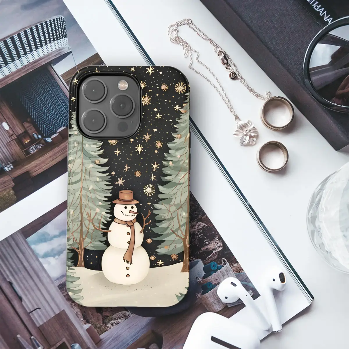 Step into a magical winter wonderland where a cheerful snowman, complete with a jaunty top hat and a warm scarf, greets you with a joyful smile. He stands nestled amongst a tranquil forest of tall, serene pine trees, under a vast, inky-black night sky. Above, a cascade of intricate golden snowflakes and twinkling stars falls gently, catching the light and adding a touch of enchantment to the silent, snowy landscape. The hand-drawn, illustrative style brings a rustic and heartwarming charm to the scene, evoking feelings of cozy nights, holiday cheer, and the simple joys of the season. This design isn't just an accessory; it's a small piece of art that carries the quiet magic of a winter's night. Let this whimsical woodland friend accompany you, bringing a spark of festive spirit and nostalgic warmth to your everyday moments. It's the perfect way to celebrate the holiday season or to carry the serene beauty of winter with you all year round.