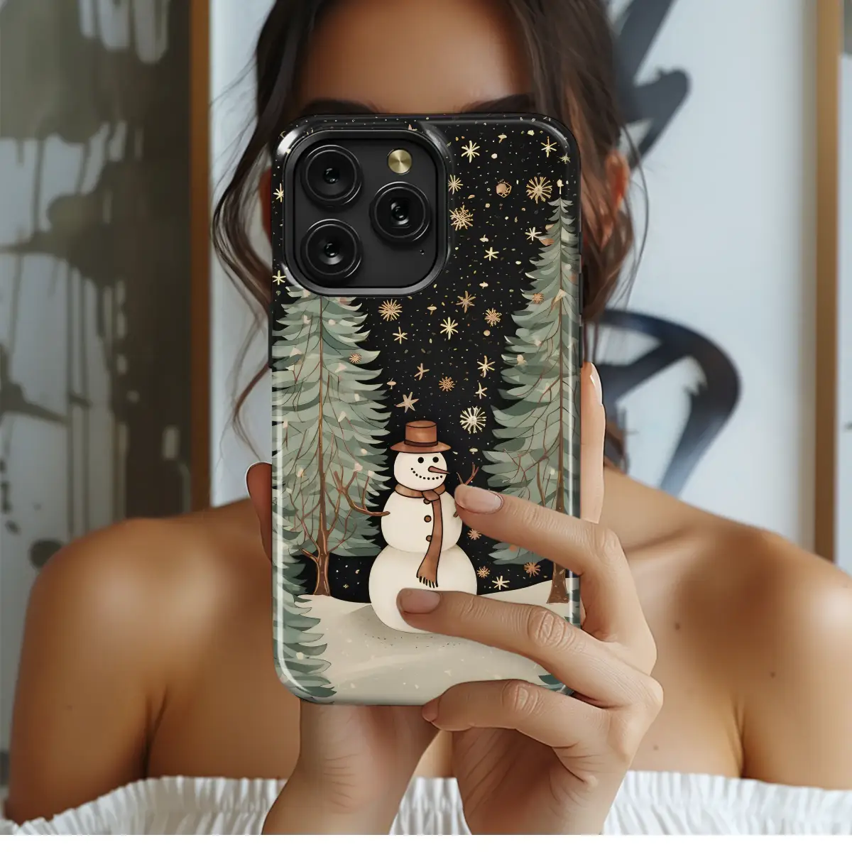 Step into a magical winter wonderland where a cheerful snowman, complete with a jaunty top hat and a warm scarf, greets you with a joyful smile. He stands nestled amongst a tranquil forest of tall, serene pine trees, under a vast, inky-black night sky. Above, a cascade of intricate golden snowflakes and twinkling stars falls gently, catching the light and adding a touch of enchantment to the silent, snowy landscape. The hand-drawn, illustrative style brings a rustic and heartwarming charm to the scene, evoking feelings of cozy nights, holiday cheer, and the simple joys of the season. This design isn't just an accessory; it's a small piece of art that carries the quiet magic of a winter's night. Let this whimsical woodland friend accompany you, bringing a spark of festive spirit and nostalgic warmth to your everyday moments. It's the perfect way to celebrate the holiday season or to carry the serene beauty of winter with you all year round.